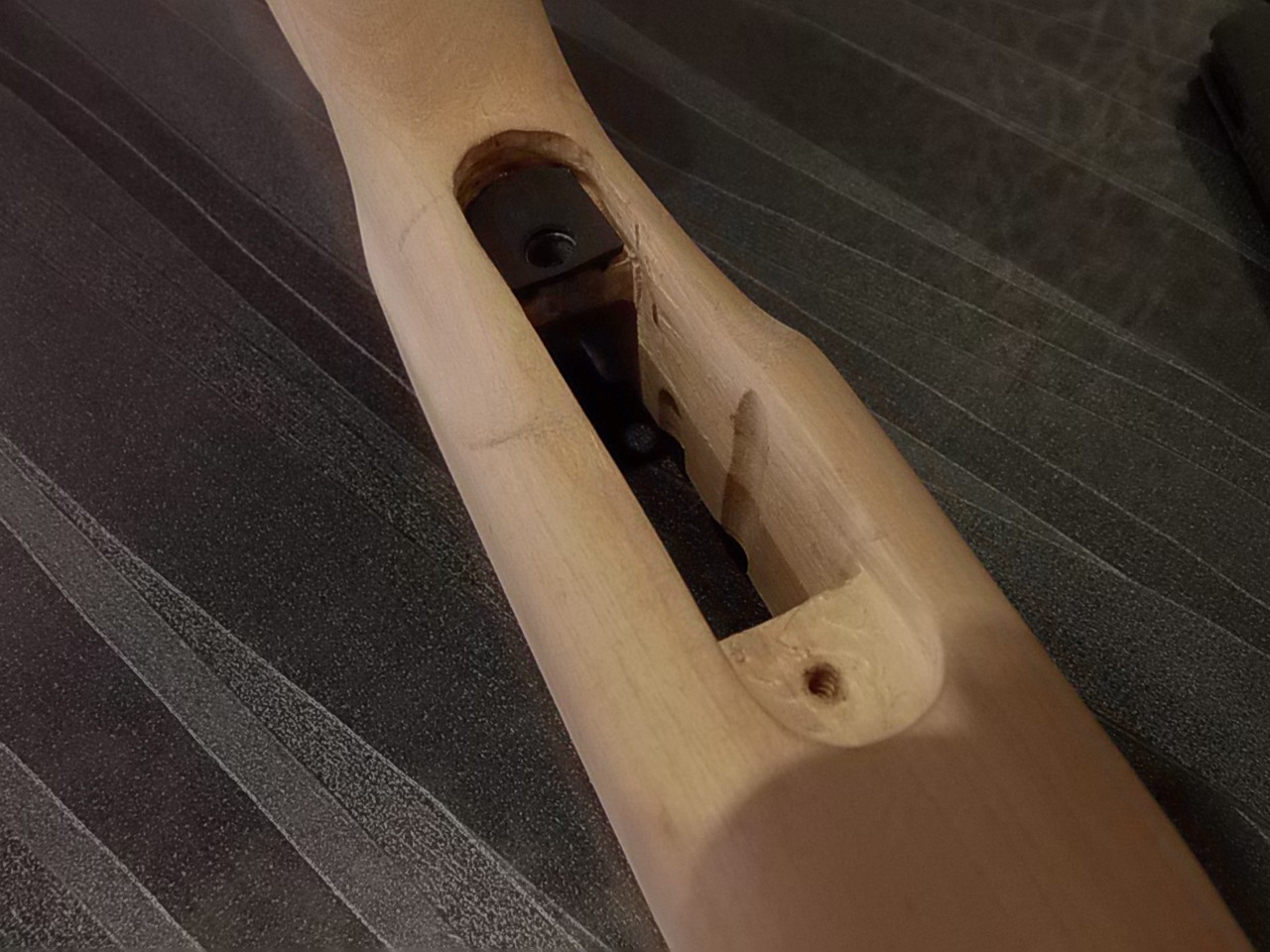 Ну и врезал в ложу выточенные втулочки на смесь ЭДП с металлическими опилками. Рассчитал так,что при закручивании полном винта с одетой шайбой рифлёной-головки винтов чуть торчали косым ободком из ложи. Втулки же были врезаны с внутренней стороны заподлицо с внутренней поверхностью ложи!То есть при вставке железа в ложу-места крепления вплотную были к втулкам!!! Ну вот примерно что я вам здесь пытался рассказать: