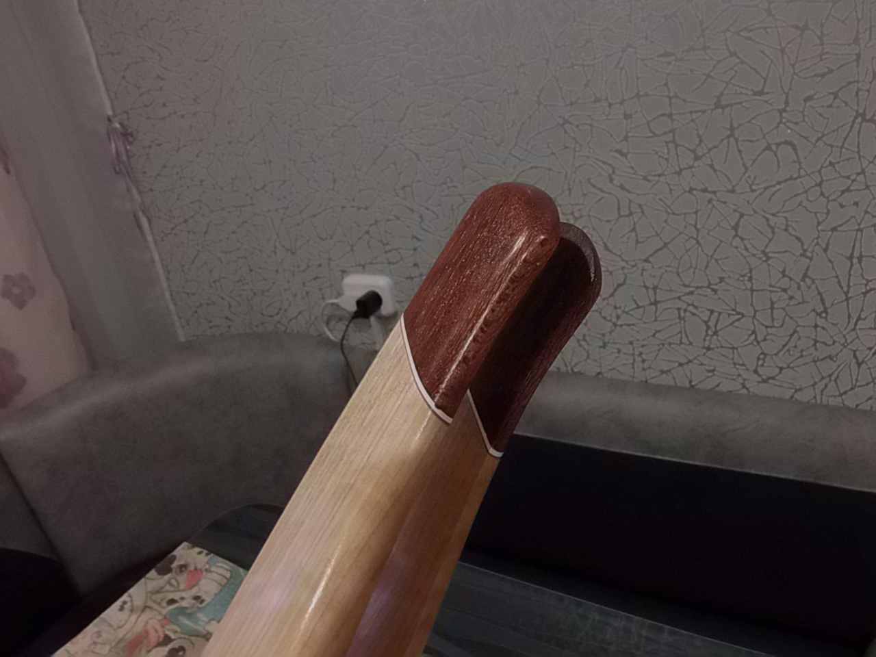 После отшлифовал место спила ровненько. Из красной индийской деревяхи сделал заготовку пяточки на основание рукояти. С запасом конечно небольшим,также вырезал из пластика белого прокладочку. Прокладка из крышки электрокороба. По уже привычной схеме крепежа сделал со стороны прилегания пяточки неглубокое отверстие Ф10мм. В это полуотверстие вклеил шляпкой саморез чёрный для гипсокартона на ЭДП строго под прямым углом. В прокладке сделал такое же сквозное отверстие под этот саморез. В основании рукояти тоже просверлился тем же сверлом на глубину посадки вклеенного самореза. Ну а потом всё собрал на ЭДП-намазал основание рукояти клеем,наложил прокладку,затем накапал в сделанное в рукояти отверстие ЭДП,намазал приготовленную «пятку» с застывшим уже в ней саморезом,вставил её саморезом в пролитое клеем отверстие,плотно всё прижал и зафиксировал скотчем туго вокруг. После высыхания старательно обработал всё наждачкой-слил пяточку с прокладкой к рукояти. Вышло вполне интересно и не лишним,владельцу также пришлось по душе: