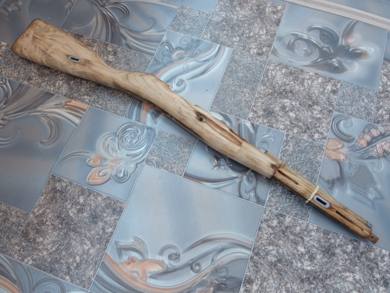 Для работы решил приобрести оригинальный комплект к карабину Мосина обр.1944года. В комплекте были: ложа оригинальная, ствольная накладка, нагель,затыльник,шомпол,ремень в полной комплектации, пружины под ложевые кольца. Антабки в ложу были уже врезаны.Приятно было что на затыльнике,ремне,ложе присутствовали клейма. Это добавляло харизмы и историчности.