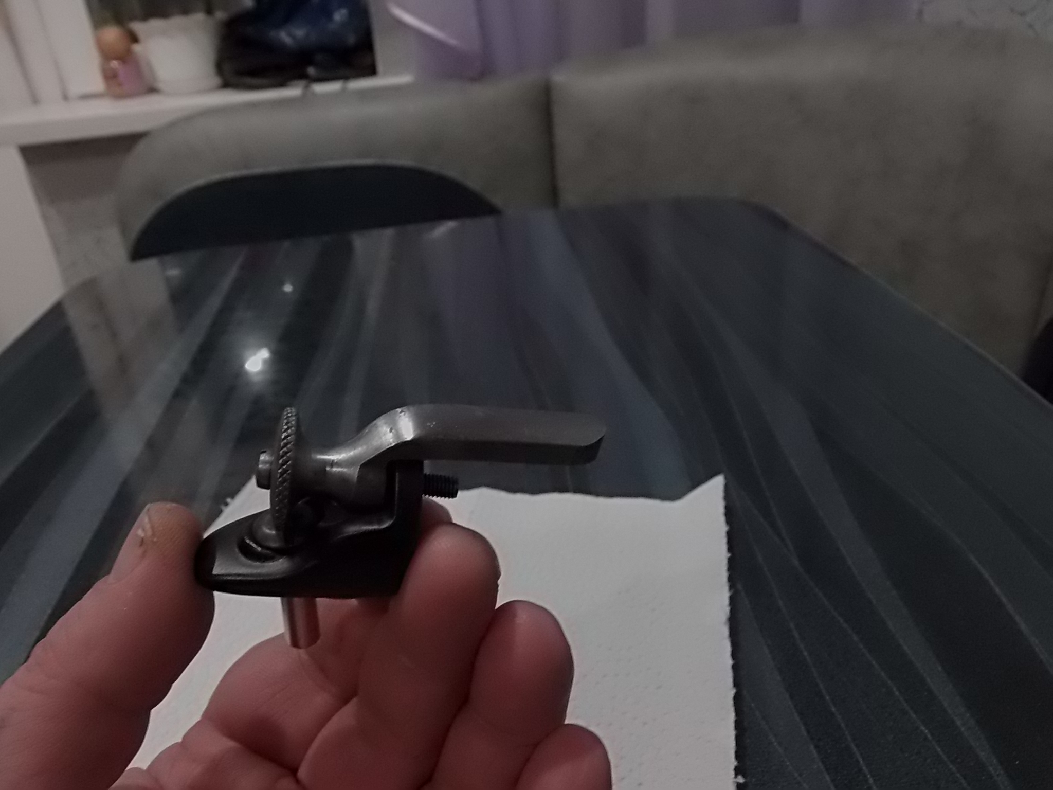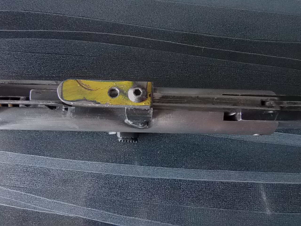 Далее приступил к изготовлению имитации затвора. У меня был кусок затвора от винтовки Мосина, но он был коротким прямым. Учитывая что планировался «снайперский» карабин-стебель нужен был загнутый вниз. Ну так более соответствующе-верно? В закромах отыскался постаревший кусок затвора от тульской мелкашки. Отрезал его, почистил, слегка отполировал и стал он отменно выглядеть. К тому же он был именно загнутый. Из куска подходящей стальной трубы отпилил болгаркой необходимый кусок, обработал,просверлил два небольших отверстия, вставил «железо» в ложу, на компрессоре отметил место крепления «затвора». Прихватил его к компрессору с помощью ЭДП с метал.пылью, через просверленные отверстия приварил, старательно обработал, отполировал. Мест сварки стало практически не видно. Как не пробовал приварить к «затвору» стебель так как надо-не получилось. Потому просверлился в его основании, нарезал резьбу М3, в приваренном «затворе» также отметил место крепления стебля,просверлил отверстие в «затворе» сквозь стенку компрессора и нарезал такую же резьбу. Подобрал подходящий винт М3, притянул стебель к «затвору» на клею с опилками для надёжности. Кончик винта буквально на 0,5мм торчал внутри компрессора-после высыхания клея обработал его надфилями. Ну и шляпку винта соответственно сточил заподлицо с основанием стебля. К сожалению идеально слить винт и стебель не удалось-есть всё же маленький ободок. Ну….Не критично! Пусть будет! Также на компрессор нужно было и планку под оптику водрузить. Специально для этой винтовки прикупил шикарный стальной кронштейн под оптику британского типа-ширина ластохвоста в нём 14мм,в наших-11мм. Очередное спасибо товарищу за отменную планку! Перед этим просверлил отверстие и нарезал резьбу в заднике УСМ. Также сразу закрутил на клей упорный винт, он упирался как говорил в ступеньку в выборке.