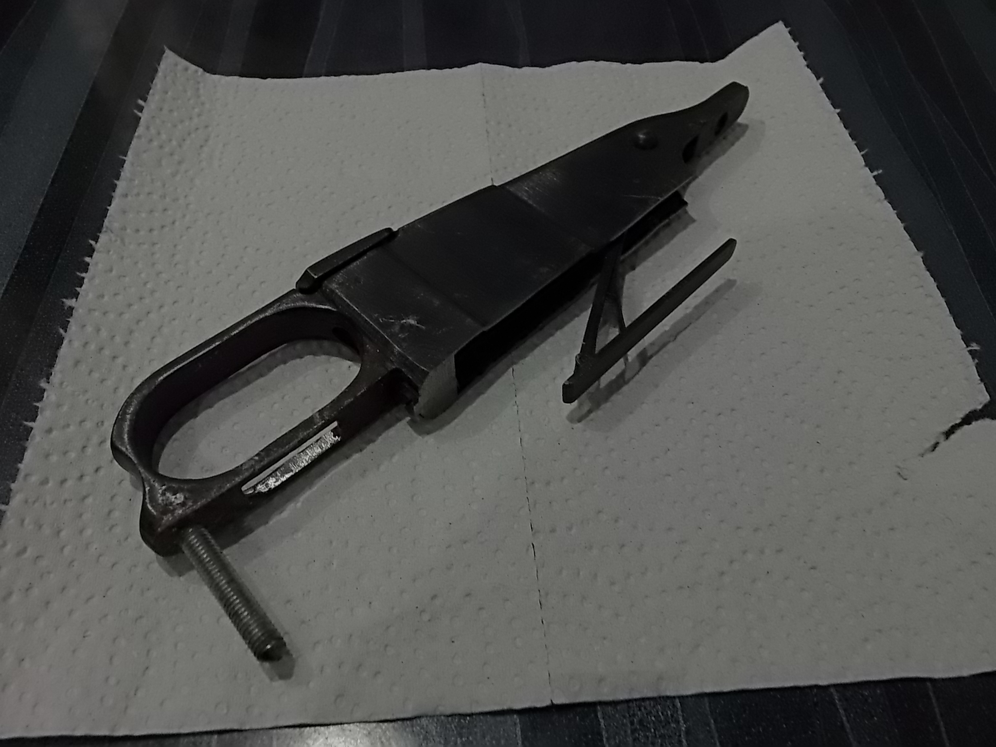 В заднике УСМ ИЖа сверлю отверстие,нарезаю резьбу М5. Устанавливаю «лапку» в выборку под неё за компрессором,в передке отверстие под винт М5,отмечаю на заднике УСМ центр этого отверстия,сверлю там его,нарезаю резьбу М5. Т.е. «лапка» крепится к заднику УСМ жёстко. Но! Кроме этого в это же отверстие крепим и «курок»!!! В основании «лапки» второе отверстие-уже под винт М6. Оно абсолютно точно совпадает с отверстием в ложе для крепежа магазинной коробки сзади. Т.е. принцип практически как в оригинальном крепеже. Ну чуток наоборот-о этом позже. Вкрученный винтик в задней части УСМ снизу-служит для упора железа винтовки в выступ в выборке родной. Он упирается в ступеньку и жёстко держит «железо» винтовки в задней части, помогает точнее надёжно крепиться ему в ложе. Ну а основной крепёж-как сказано выше. Это та самая «лапка» объединённая с задником винтовки и магаз.коробкой. В общем сделал я слепок нужной мне «лапки» в заднюю часть ложи. Решили что будет правильно напечатать эту деталь из отменного пластика со 100% заполнением его. Чтобы была «как камень». Ну и отправил Руслану сделанный слепок: