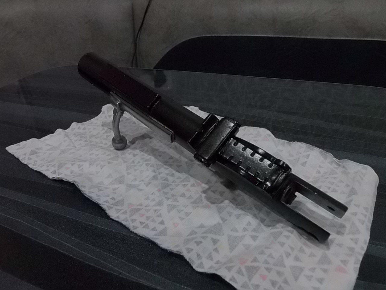 Позже всё зачищенные навершия заворонил, также спусковой крючок, намушник подворонил, фальшствол ещё до вклейки был заворонён. Ложевые колечки, пружины, маг.коробка были оставлены в родном воронении. На колечках и пружинках по граням были интересные потёртости-этот эффект старения было решено сохранить. Добавляли они некоторого шарма и аутентичности. Ну а коробка вообще просто отменно выглядела! И теперь при сборке вышло вот так-щели между ствольной накладкой и уголками с навершиями приклеенными к основной ложе минимальны: