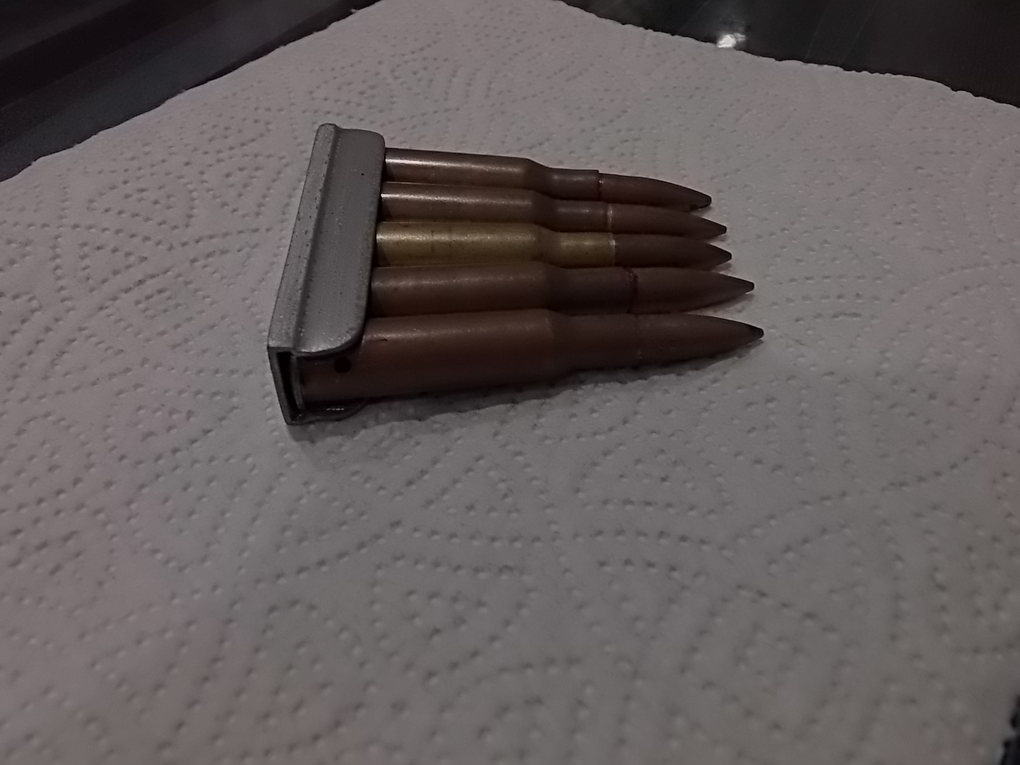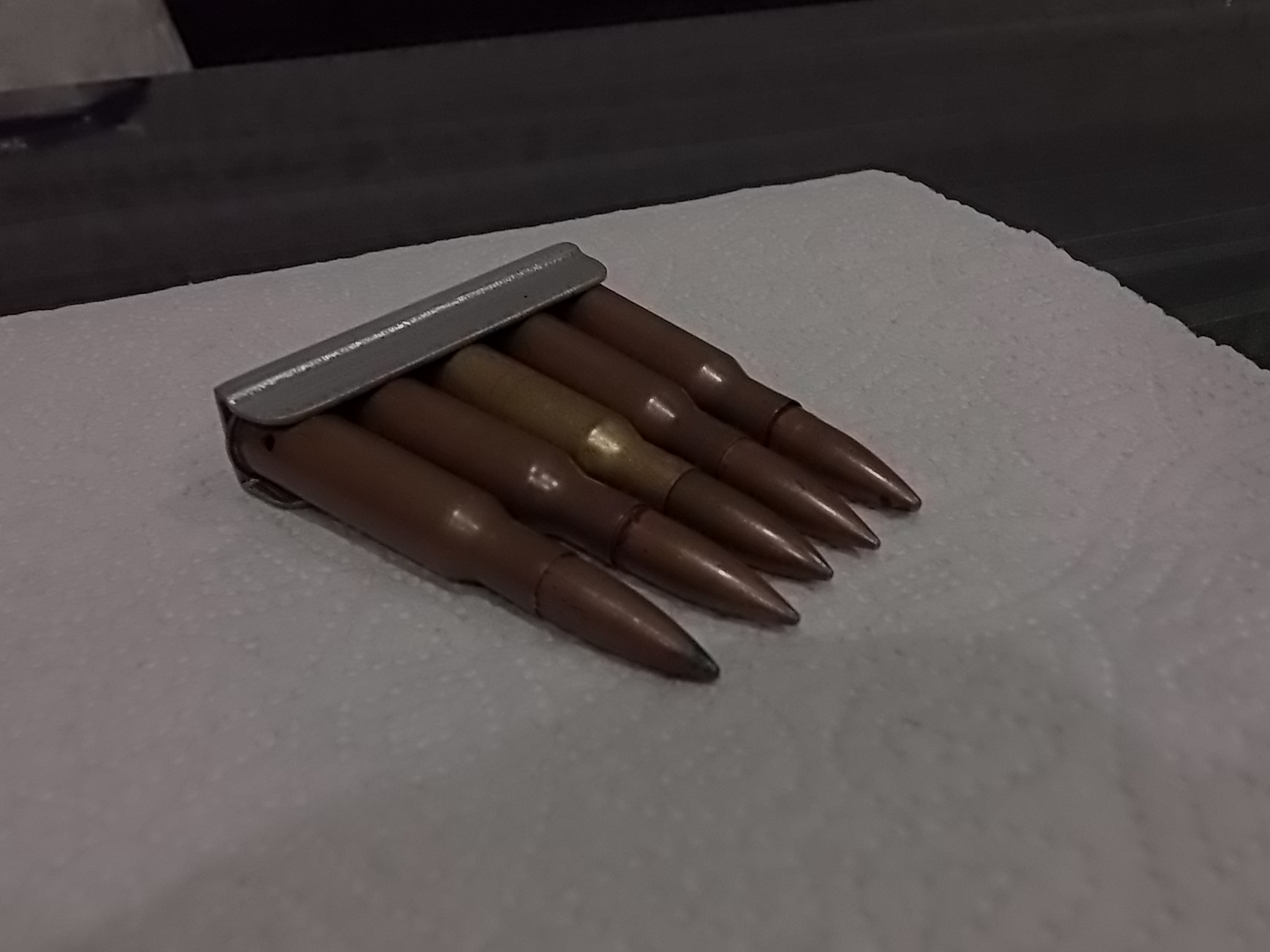 Пока ожидал приезда деталей, занялся магазин.коробкой. С ней мне тоже дружок К. помог, частенько выручает меня всякими «железками» мелкими. Коробка в целом была исправна-хотя это было не так важно. Но всё же исправная кнопка,подаватель и клейма на крышке были безусловно приятны и подчёркивали подлинность её. Резьба к сожалению в заднем крепеже была сорвана. Но это была не проблема! Прежде всего обрезал коробку болгаркой в верней части до нужной мне высоты. Целая коробка упиралась во вставленное в ложу железо. А в заднее крепёжное отверстие врезал на ЭДП с метал.опилками шпильку стальную с резьбой М6. Приготовил для крепежа через «лапку» и втулку. Сделал её из мебельной стяжки чуть доработав её и заворонил.
