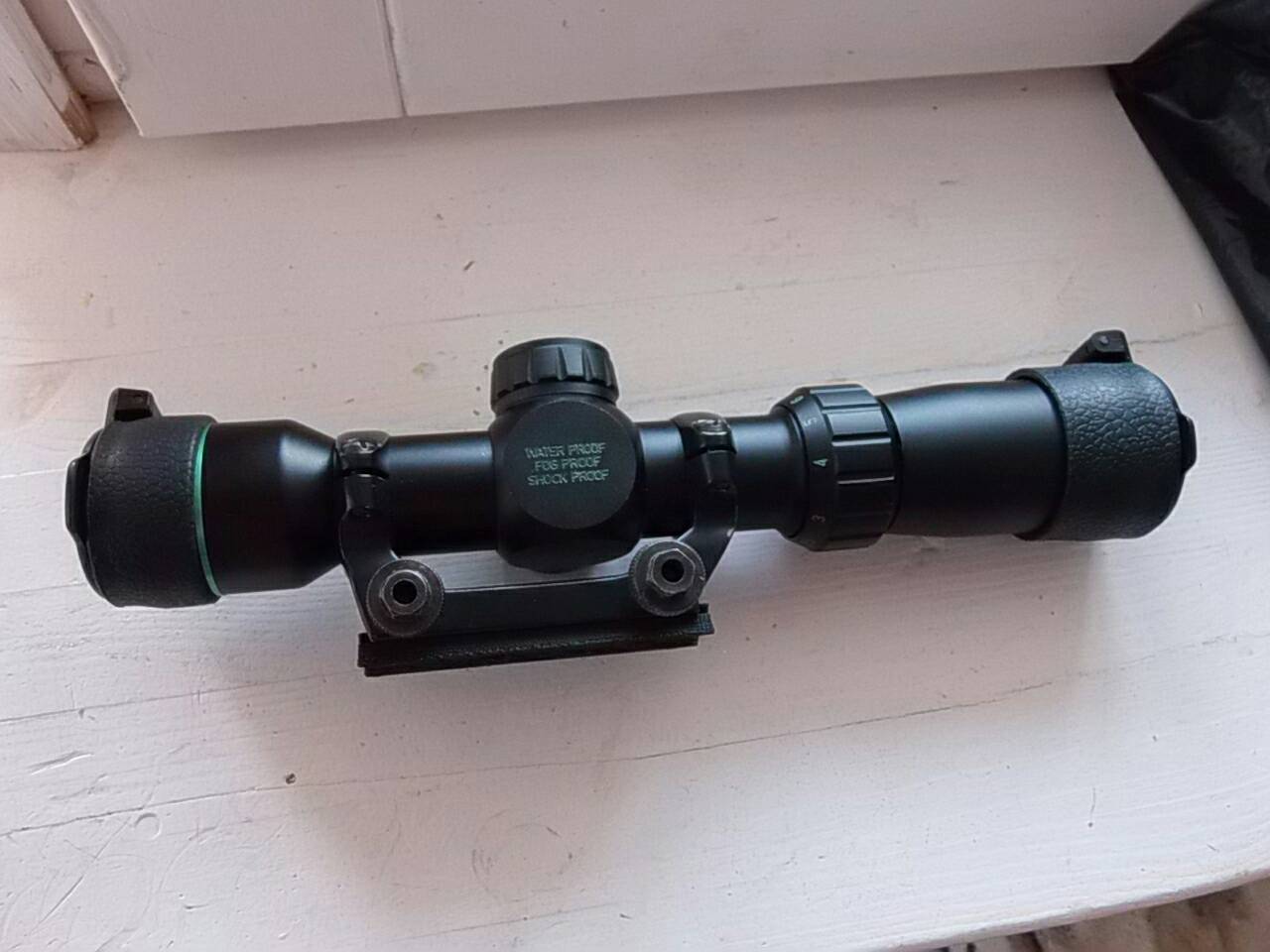 ....Ну и оптику решил поставить не ПУ, а прицел поближе схожий с ПЕ. У ПУ есть один недостаток-он короткий и шею приходится к нему хоть немного, но тянуть! Этот прицел я примерял под себя-с ним вкладка просто идеальна. У него хороший айрелиф-вскинул карабин, уложил морду на приклад-прицел точно по уровню глаза и тянуться к нему не надо. Картинка чёткая с приятной глазу сеточкой мелкой.....