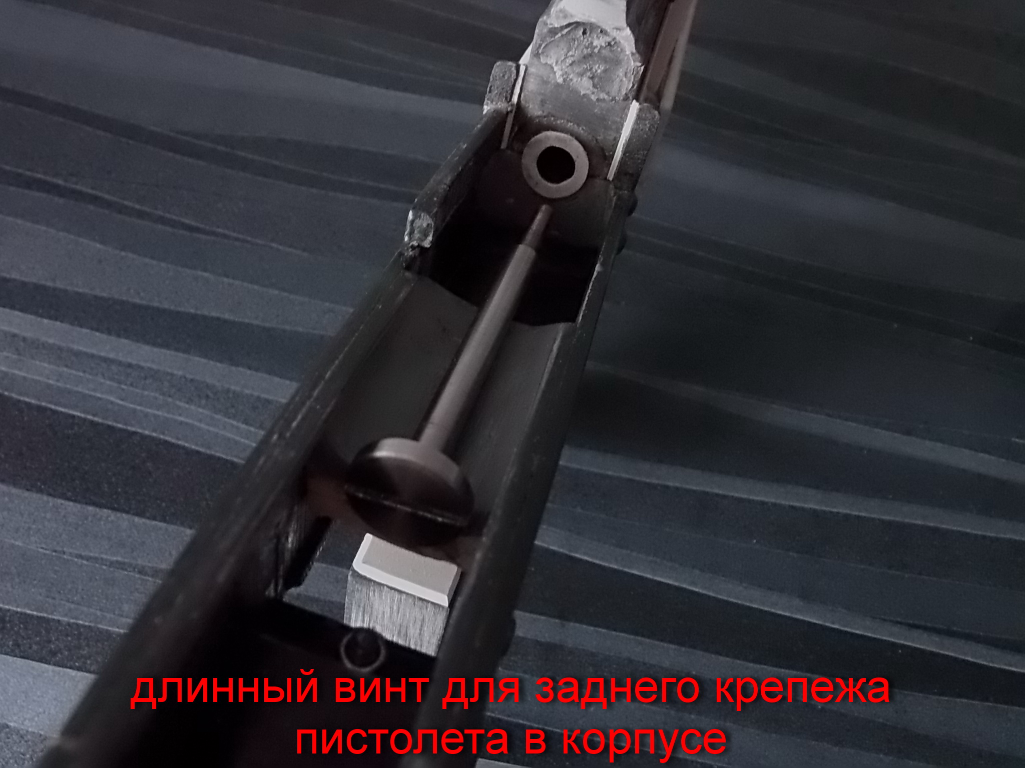 Крепёж пистолета в корпусе решил оставить в том же виде,как он крепился в родной рукояти(ложе) Кандара-сзади винтом М4 и снизу винтом М5. Для заднего крепежа пришлось выточить специально длинный винт.Отверстия нужные просверлил.И вот так выглядел крепёж-нижний внутри скобы на винт чёрный под шестигранник,задний под широкую шлицевую отвёртку. Крепление пистолета оказалось весьма надёжным-садится в корпус плотно и хорошо притягивается винтами: