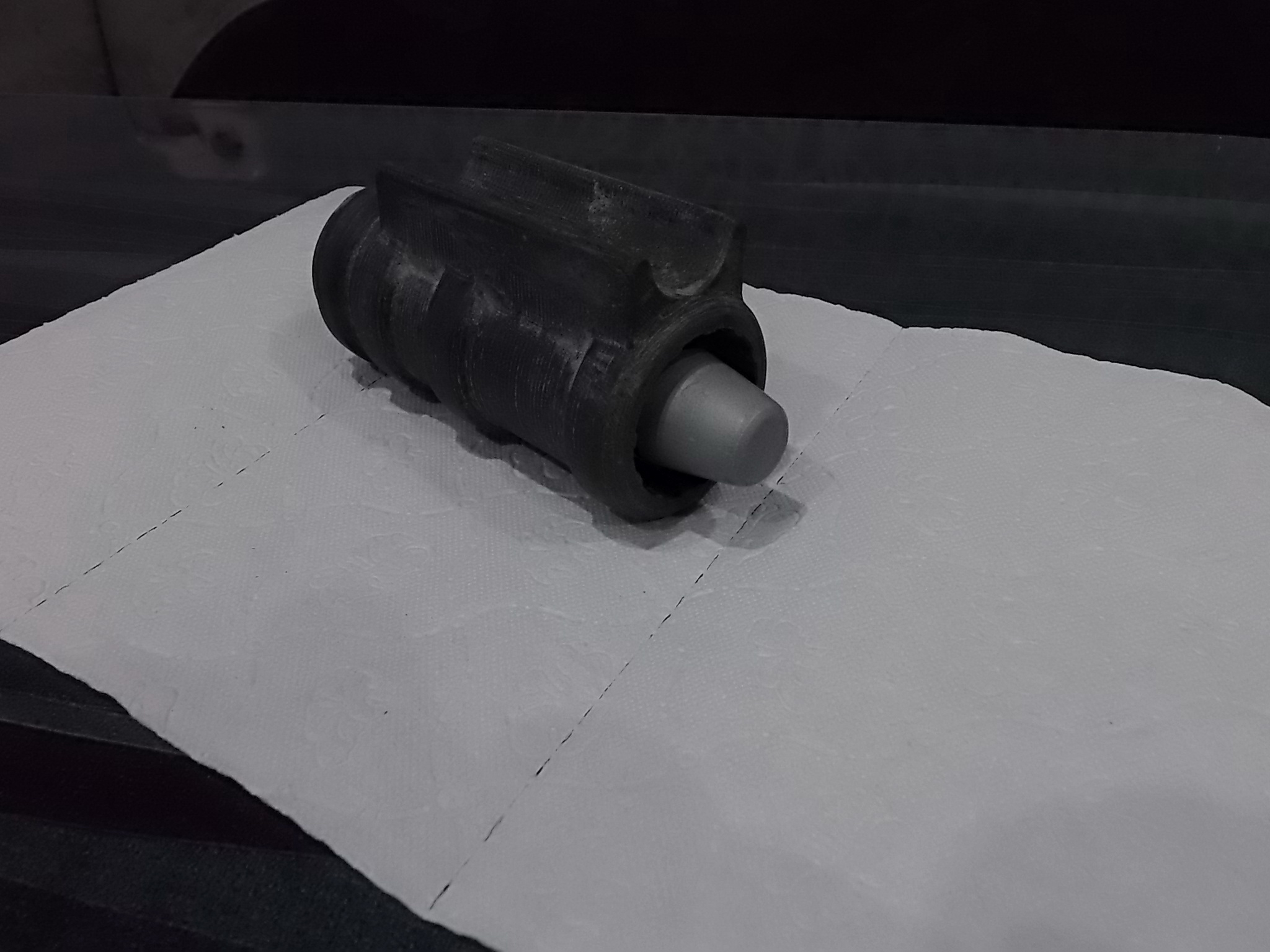 Работу с внедрением пенала в магазин отложил на время. Пока мудрил это,был мне прислан напечатанный к этому времени корпус подствольного гранатомёта и некоторое подобие гранаты для него ВОГ25П. Решено было сделать и эту «гранату» с определённым функционалом! А именно она должна была стать пеналом для запасного баллончика с кислотой! Чего ей просто так торчать в гранатомёте? Пусть хоть что-то полезное будет в ней!Верно? На «гранате» были сделаны типа нарезов элементы. Внутри корпуса гранатомёта также ответные нарезы. Т.е. граната-пенал вставлялась и извлекалась из трубы гранатомёта по направляющим «нарезам». Обрабатывал напечатанное как обычно-зачистка,шпаклевание,зачистка. Позже «гранату» окрасил после грунтования,придав ей некоторую состаренность пошаркав по ней 2000-0й наждачкой. Чтобы граната эта надёжно крепилась-в трубе гранатомёта вклеил подпружиненный шарик. В гранате также сделал углубление под этот шарик. В итоге-вставляем в задницу гранаты запасной баллончик,по отмеченному нарезу толкаем гранату в подствольник до щелчка! Щёлкнуло-значит граната в трубе зафиксирована. Она не выпадает оттуда,углубление под баллончик расчитано точно и в диаметре,и по длине. Никакого дребезга и шата ни гранаты,ни баллончика! Для надёжности вклеил внутрь гранатомёта мощную пружинку. Вышло всё как хотелось: