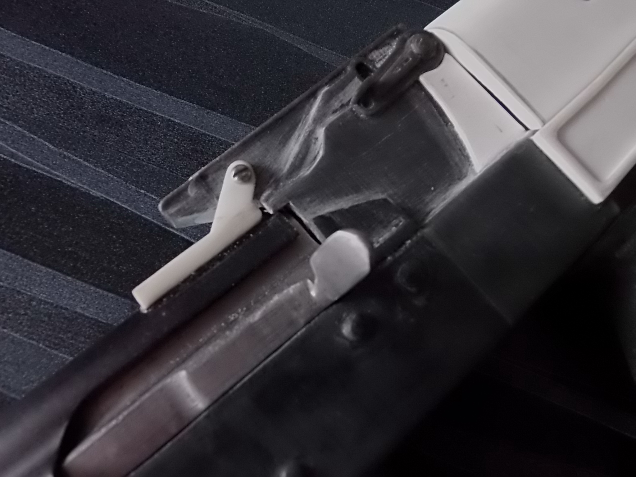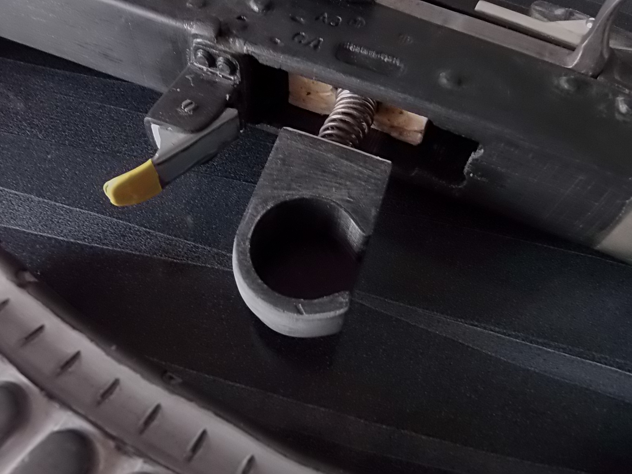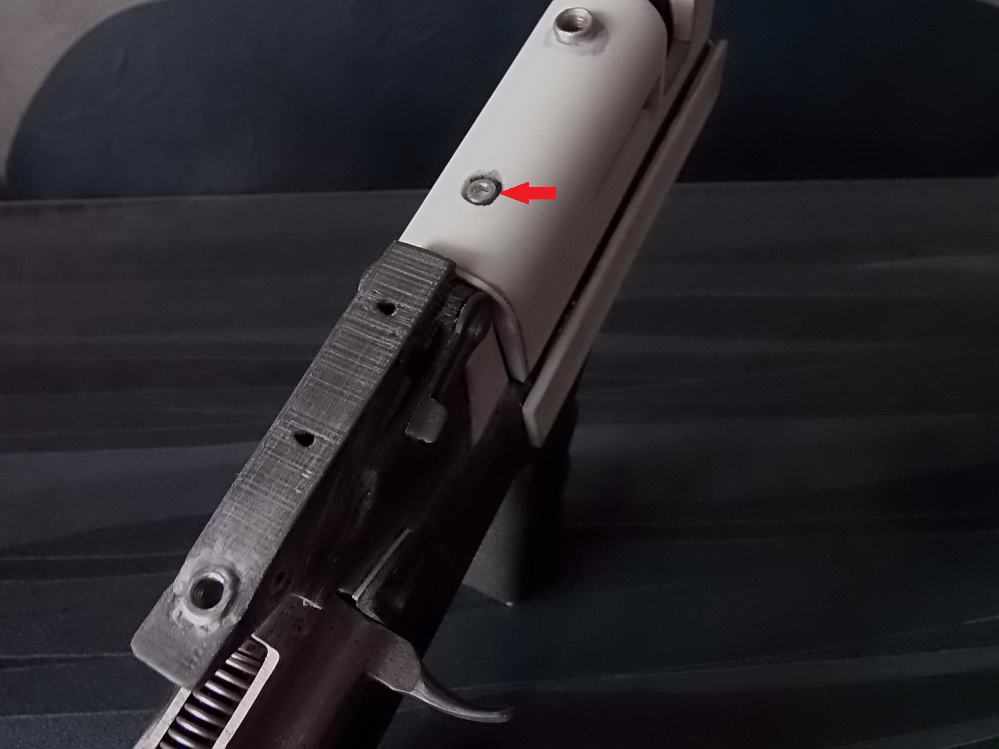 Для более надёжного крепежа крышки ствольной коробки впереди и была напечатана петля из прочного пластика. В оригинале крышка «Грозы» поднимается вверх на такой петле. У меня этого не выходила из-за угла на колодке под целик. Потому крышка моя снимается полностью с коробки. Приклеил петлю к крышке на цианокрилатный клей с метал.опилками. Затем наметил на колодке под целик отверстия в ушках петли. Снял крышку и просверлил отверстие насквозь. В него вклеил шестигранную втулку с внутренней резьбой М3. Села в отверстие она на ЭДП туго за счёт своих граней. Теперь можно одеть крышку на место,защёлкнуть её кнопкой на возвратной пружине надавив на неё сверху,а затем закрутить через ушки петли 2 крепёжных винтика во вклеенную втулку. Примерно так всё: