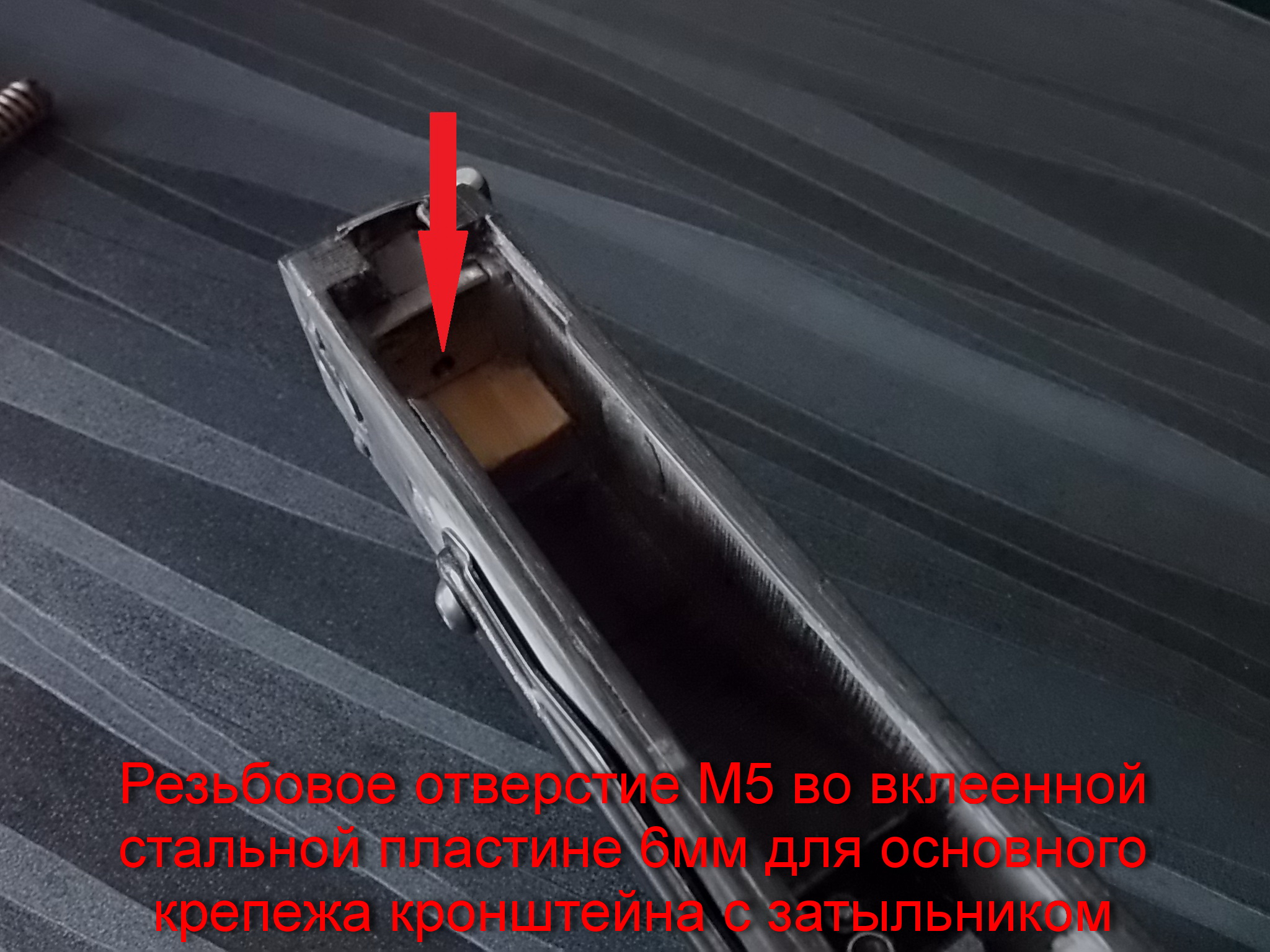Теперь можно было подумать о креплении затыльника и кронштейна к коробке ствольной. Ну само собой всё также обработал наждачкой,зашпаклевал,опять почистил. Потом подыскал подходящий винт М5 под шестигранник для скрытого крепежа. Подогнал чуть рог в верхней части кронштейна к затылку крышки ствольной коробки. Потом совместив отверстия склеил намертво кронштейн с затыльником. В коробке ствольной из подручного смудрил имитацию кнопки складывающей затыльник/приклад. На кронштейне слева имитировал петлю для складывания. Я решил не мудрить со складывающим механизмом,а закрепить затыльник с кронштейном на винт к задней плоскости коробки. Рог в верхушке кронштейна плотно упирался в крышку,ступенька чуть ниже упиралась в самый низ крышки. Тем самым фиксация крышки на коробке была ещё надёжнее!!! Ну а для крепления кронштейна с затыльником я сделал соосное отверстие в заднице коробки,затем выточил на наждаке квадратик стальной толщиной 6мм, вклеил его внутри коробки в заднюю часть,наметил отверстие,просверлился и нарезал нужную мне резьбу М5. Под ним вклеил дубовый брусочек для нижнего крепежа. В него снизу будет вкручиваться саморез. Итог-после установки крышки коробки и фиксации её кнопкой на пружине и впереди двумя винтиками за петлю на крышке,устанавливаем по месту кронштейн с затыльником,вставляем винт М5,затягиваем его,затем снизу фиксируем саморезом и получаем жёсткую надёжную конструкцию: