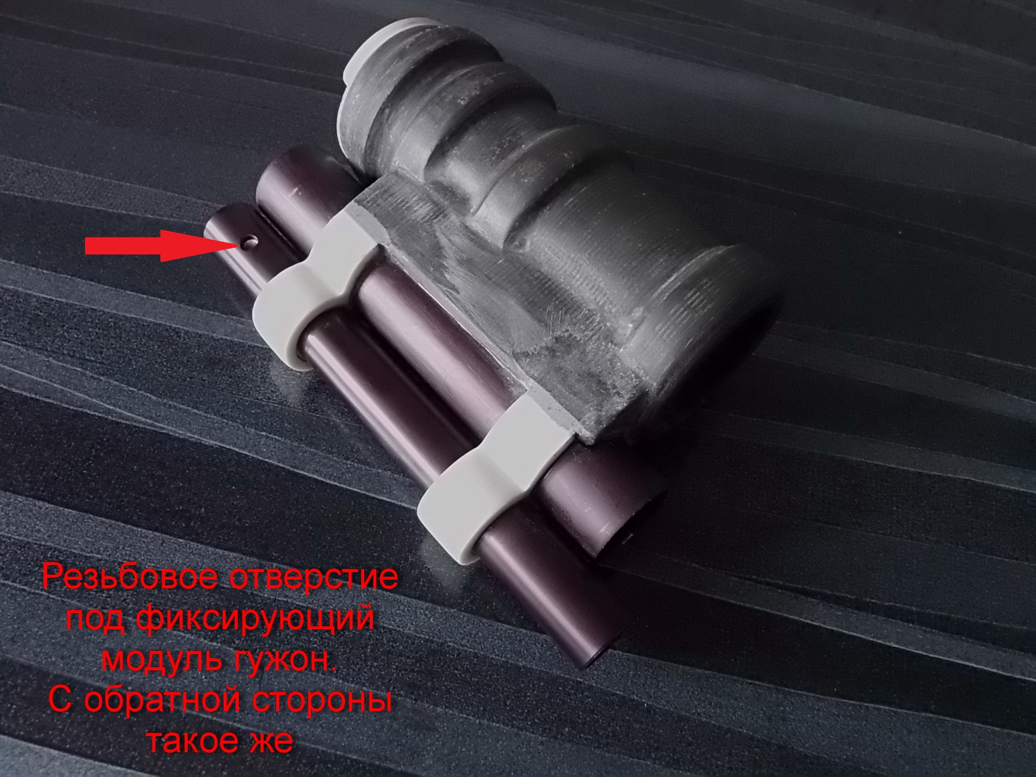 Также были найдены две нужные алюминевые трубки.Одна для фальшствола,вторая для крепежа гранатомёта.После некоторой токарной обработки они были с помощью дружка Артёма заанодированы.Вот трубки и присланные на тот момент перечисленные детали. В фальшстволе впереди нарезана резьба для посадки ДТК. В задней части(в боках) два отверстия под гужоны. Они будут крепить надёжно фальшствол на стволе пистолета: