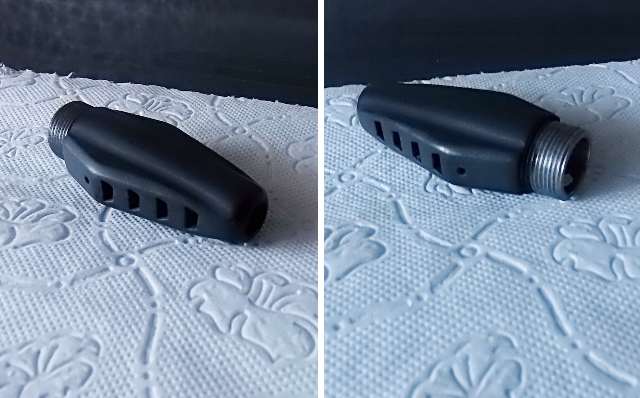 Дошла очередь до дульного тормоза. Его также нет в оригинале ОЦ-14. Ну какое-то окончание в виде кольца и не более. Я же хотел завершить ствол красивым ДТК. Ну и совместными с Русланом усилиями смудрили сделать такой. Моделировал и печатал Руслан. Назвать решили что-то вроде «Гремучник»-больно он похож очертаниями на голову гремучей змеи. Ну и после старательной обработки его,зачистке,шпаклеванию он был загрунтован,а затем окрашен чёрной матовой краской. Предварительно в задницу ему была вклеена втулка стальная с такой же как в фальшстволе резьбой-М16Х1. Спозиционировал её сразу так чтобы при тугом закручивании ДТК становился ровно по осям без перекосов. Ну а после основательной сушки краски немножко придал ДТК вида металлического,сделав немножко потёртостей и хорошенько натерев его 2000-ой наждачкой. Вышел вот такой «Гремучник»: