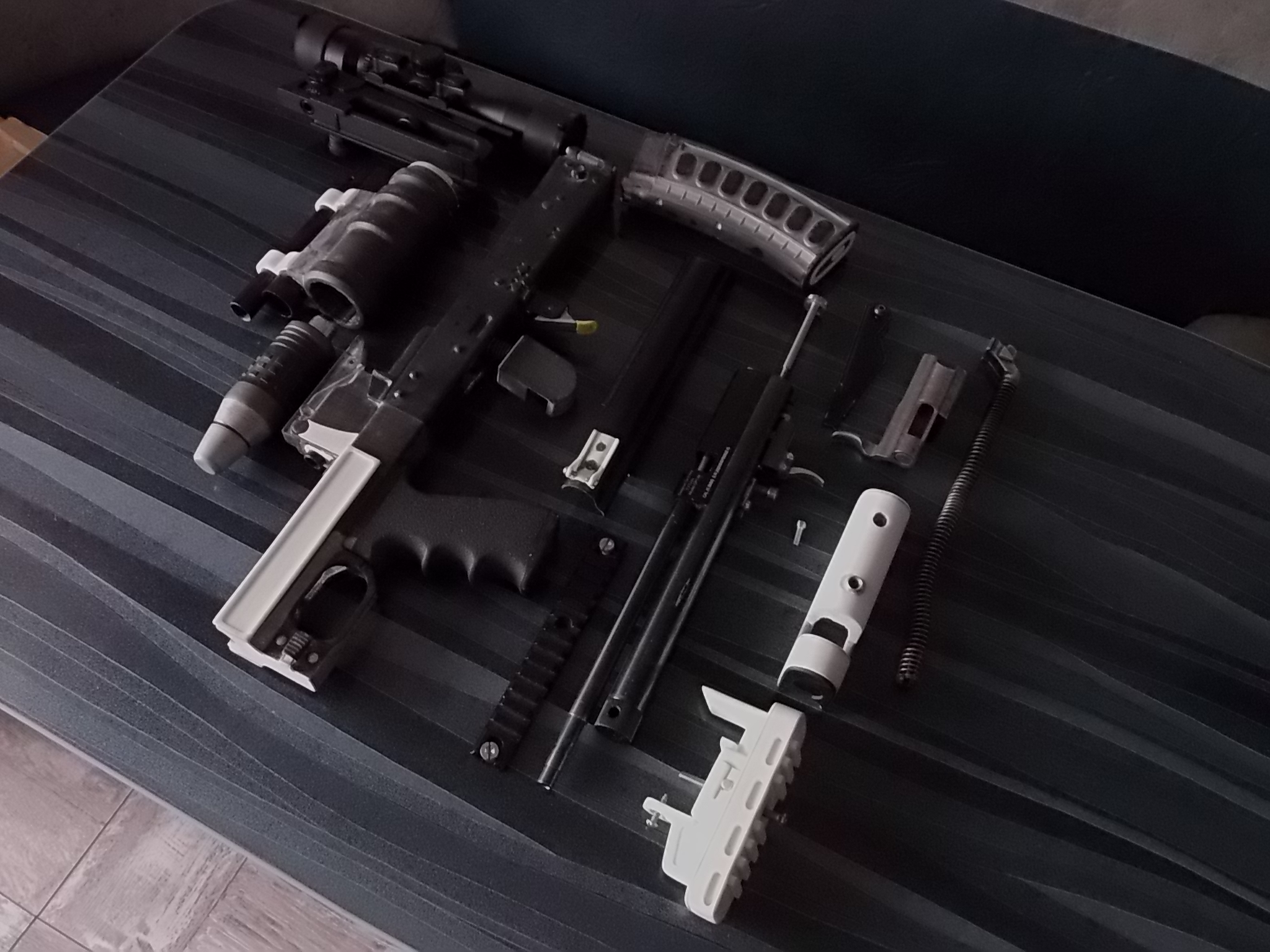 Теперь о затворной раме,возвратной пружине и крышке ствольной коробки. Крышка была взята от «Юнкера». В ОЦ-14 крышка с рёбрами. Я решил поставить обычную гладкую как в начальных версиях «Грозы». Затворная рама от того же «Юнкера». Я отрезал от неё всё что мне было не нужно,зачистил от появившейся ржавчины. Боевая пружина оттуда же-её укоротил на 8см. Очень тугая она была для моего изделия. Вообще изначально планировалось объединить затвор пистолета с этой затворной рамой-т.е. взведение затвора производить рамой «Юнкера». Но дело в том,что на коробке напечатанной салазки под раму были также пластиковыми,а по ним рама «Юнкера» очень плохо двигалась. Ах да! Чуть не забыл! Рама затворная подвижна! При сборке она вставляется в заднюю часть коробки на направляющие и двигается вперёд к казне как к примеру в АК. Но не удалось мне толком додумать такой интегрированный затвор,потому опустим это и забудем. Рама эта будет лишь антуражем,а взводиться и подавать боеприпас в казённую часть будет родной досылатель пистолета. Вот так складывалась картинка на тот момент.Всё крепится практически также как в АК: