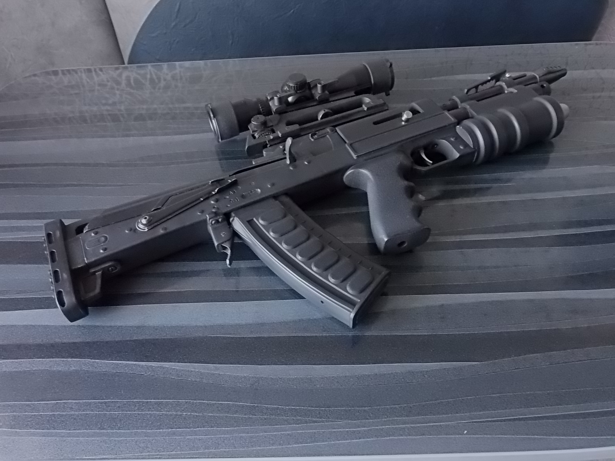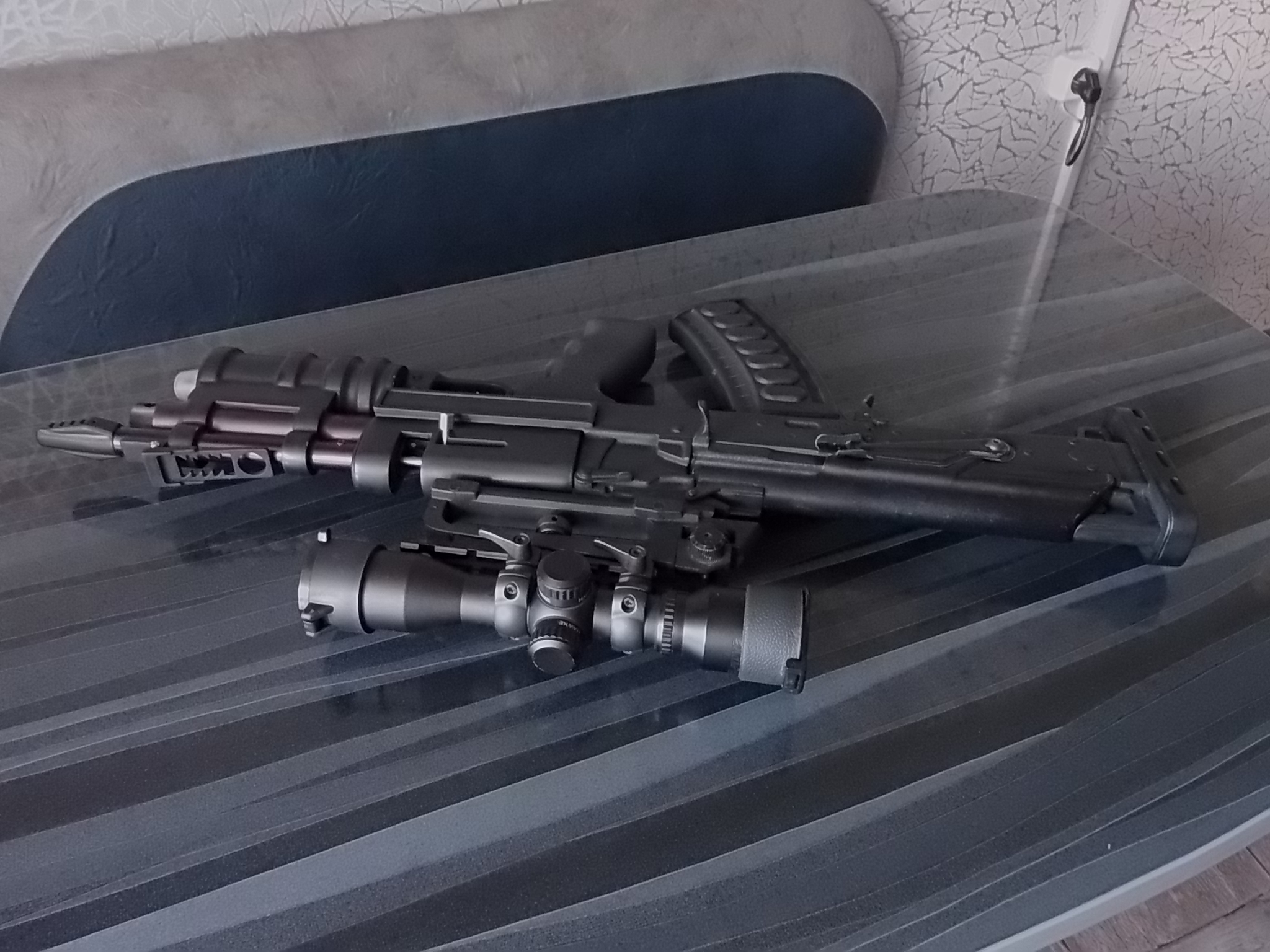 Давно хотелось сделать что-то необычное, не стандартное что ли. Листая картинки, наткнулся именно на ОЦ-14. Как-то спонтанно и пришла мысль стилизовать именно такой образец. Повторю-СТИЛИЗАЦИЯ!!! Не КОПИЯ!!! Деталей требовалась масса. Но зная способности товарища своего был уверен-он и смоделирует,и напечатает всё в лучшем виде!!! Человек талантливейший! Ну и не ошибся-он сразу сказал: «Сбацаем!Что тут думать?» Конструкцию решили делать модульную-что-то склеивалось,что-то собиралось на винтах.