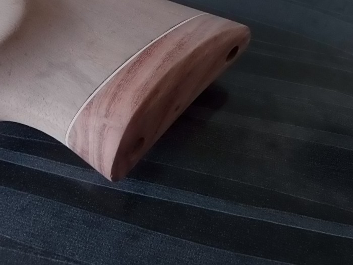 Потихоньку, аккуратно чтобы не задеть нанесённую лазером насечку всё стёр, затем Р180 всё загладил уже по волокнам. Кстати шкурилась древесина с лаком на моё удивление весьма легко. Ну и вот так вышло: Ну уже многие знают-люблю я декором лож заняться. Потому сразу было решено сделать из красивой породы из солнечной Индии затыльник на приклад, пятку на рукояти и как без этого-нос цевья. По привычной технологии (которую не раз описывал) сделал сначала пятку на рукоять с небольшим запасом на чистовую обработку: После закрепил её надёжно на рукояти винтовки. Между пяткой и рукоятью сделал прокладку из белого ПВХ пластика от электрокороба. Легко обрабатывается, полируется и даже после нанесения пропитки всё равно остаётся белый. После высыхания клея обработал пятку с прокладкой и слил с рукоятью. Итог: После изготовил затыльник на приклад. Про прокладку белую конечно не забыл. Притянул затыльник с прокладкой к прикладу на саморезы с ЭДП. Оторвать не выйдет-всё намертво просто. Основательно высушил и подогнал всё с помощью наждачки на оправке к прикладу. Красота и удобство: Теперь надо было подумать как расположится в ложе сама «Мурка». Примерил и решил воспользоваться крепежом «железа» сзади через втулку уже врезанную в ложе турком. Передний крепёж требовал нового отверстия. Ну и чёрт с ним! Сделаем новое! Выкрутил втулку в передней части цевья-позже её и применил. Ну о этом чуть позже. А на тот момент из берёзовых досочек соорудил 2 вставки. Они повторяли весь контур родной выборки в ложе-плотно всё подогнал к стенкам в ложе. Конечно были вклеены эти вставки на ЭДП, на этот же клей сделал вставки и на лицевой стороне-полукруглые под затвор и не знаю ещё что. Всё отлично склеилось под давлением струбцин. Вот так получилось: После отпилил родной нос цевья. Ровно столько сколько было необходимо по задумке-а думалось поглубже спрятать в ложу пластиковую казну: Из той же экзотической древесины что Маугли передал в виде поддона со стеклопластиком прутком, сделал заготовку с припуском носа цевья и прокладку. Скрепил новый нос и прокладку на ЭДП, и по той же технологии что и пятку на рукоятку, приклеил я и новый носик цевья: Ну и потом оправки, наждачку в руки и подогнал новый нос к ложе. Намертво всё присохло и можно было смело нажимать на оправки. Замечательно всё вышло и понравилось мне весьма:Далее приступил к врезке компрессора в ложу. Неспешно, постоянно примеряя, с помощью полукруглых и прямых стамесок, ножей. Не обошлось конечно без моего отзывчивого дружка/помощника Руслана. Свои за последние пару лет затеи не представляю без его участия! Талантище!!! Самец!!! Трудяга мыслящий и способный сотворить любую мою порой непростую, непонятную прихоть. В общем сделал он целый набор деталей для меня(о них позже),среди них сделал скобу 1 в 1 c немецкого « HAENEL ZUHL-312». Очень мне нравятся эти скобу зулёвые-классно смотрится и очень удобные формы. Ну и подогнал эту скобу в выборку под неё. Скоба разумеется была после печати зачищена, загрунтована и окрашена с акцентом на металлическое происхождение. Крепилась она на два самореза. Позже я закрепил её навсегда(сделал несъёмной) на 2 чёрных самореза с округлыми головками под шлиц. Не люблю я под «крестик» винты и саморезы на оружии. Саморезы увидите чуть позже: Ну а потом…..Просил же человек необычного, эксклюзив