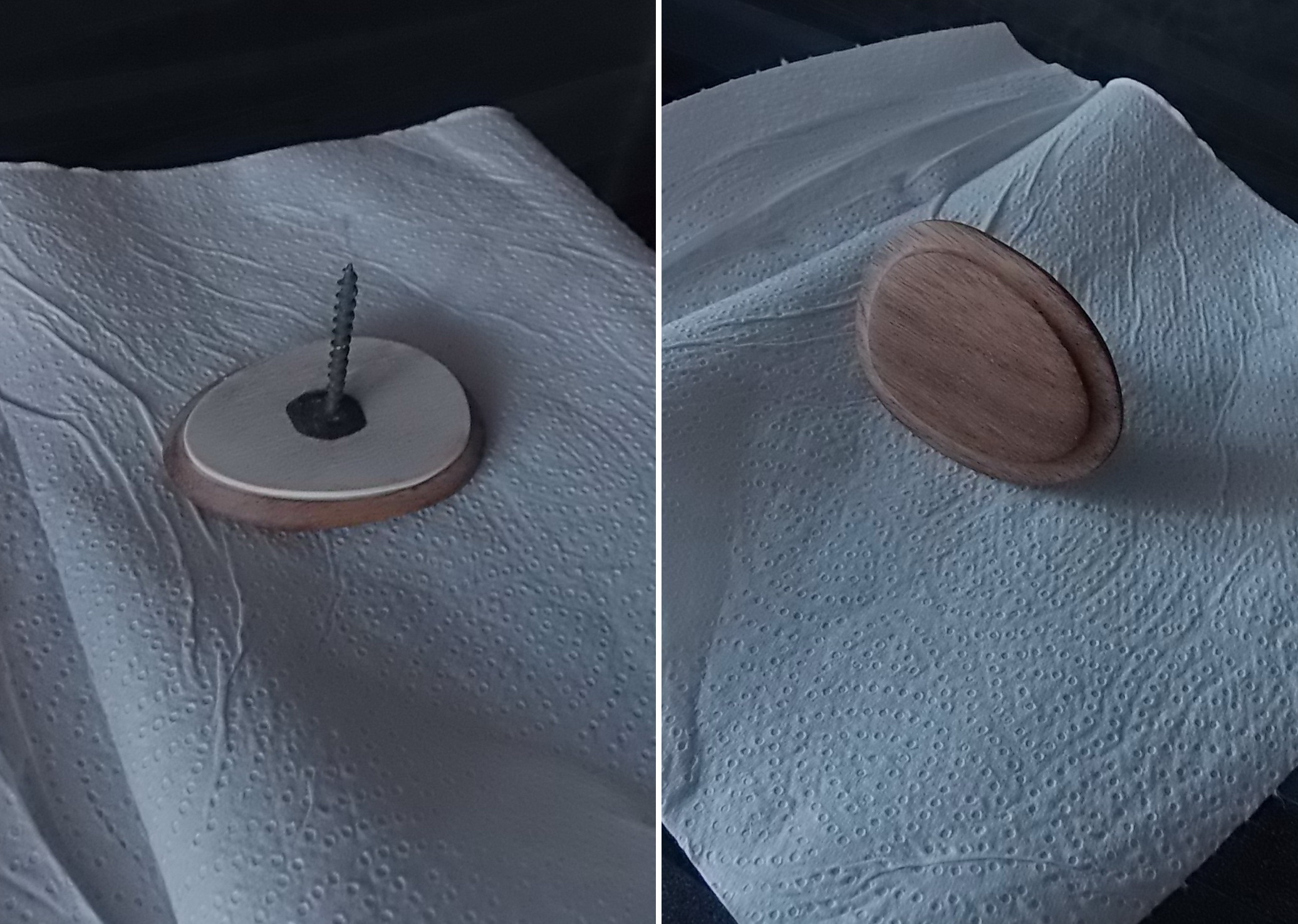 После пропитки конечно же они притемнились относительно ложи заметно, но решено было сделать эти шероховатости ещё более тёмными. Покрыл их аккуратно морилкой водной «Палисандр». После высыхания прошёлся по наколотке окрашеной 2000-ой наждачкой. Итог: