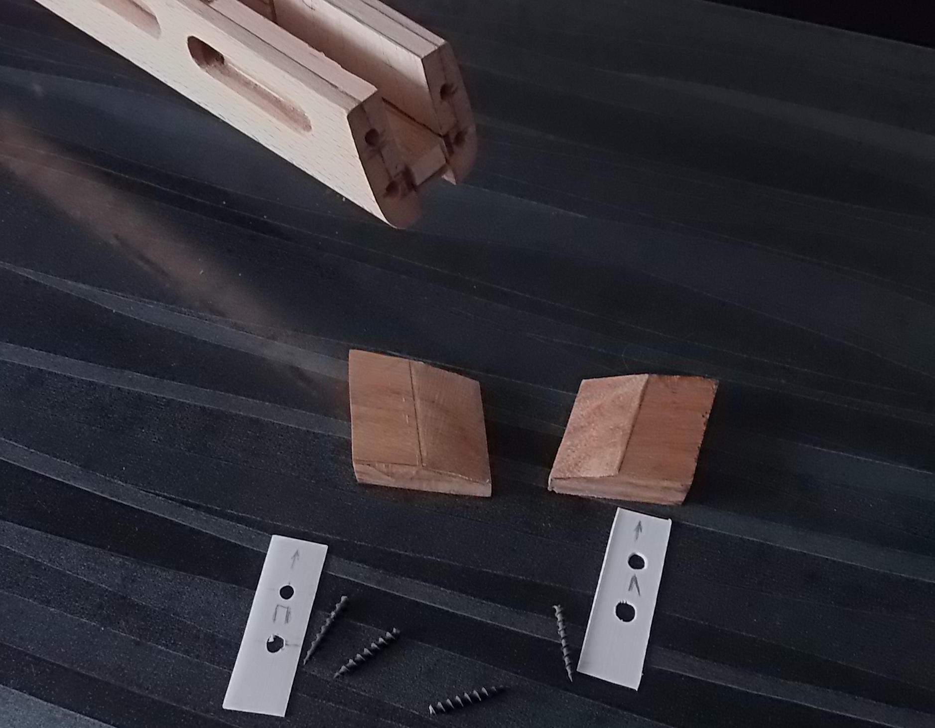 А вместо отпиленной части цевья я изготовил заготовки из этой же экзотической древесины. К ним заготовки прокладок белых и четыре шпильки/самореза. Просверлил нужные отверстия и собрал всё на ЭДП. Вот тут подготовка и итог всего задуманного на цевье: