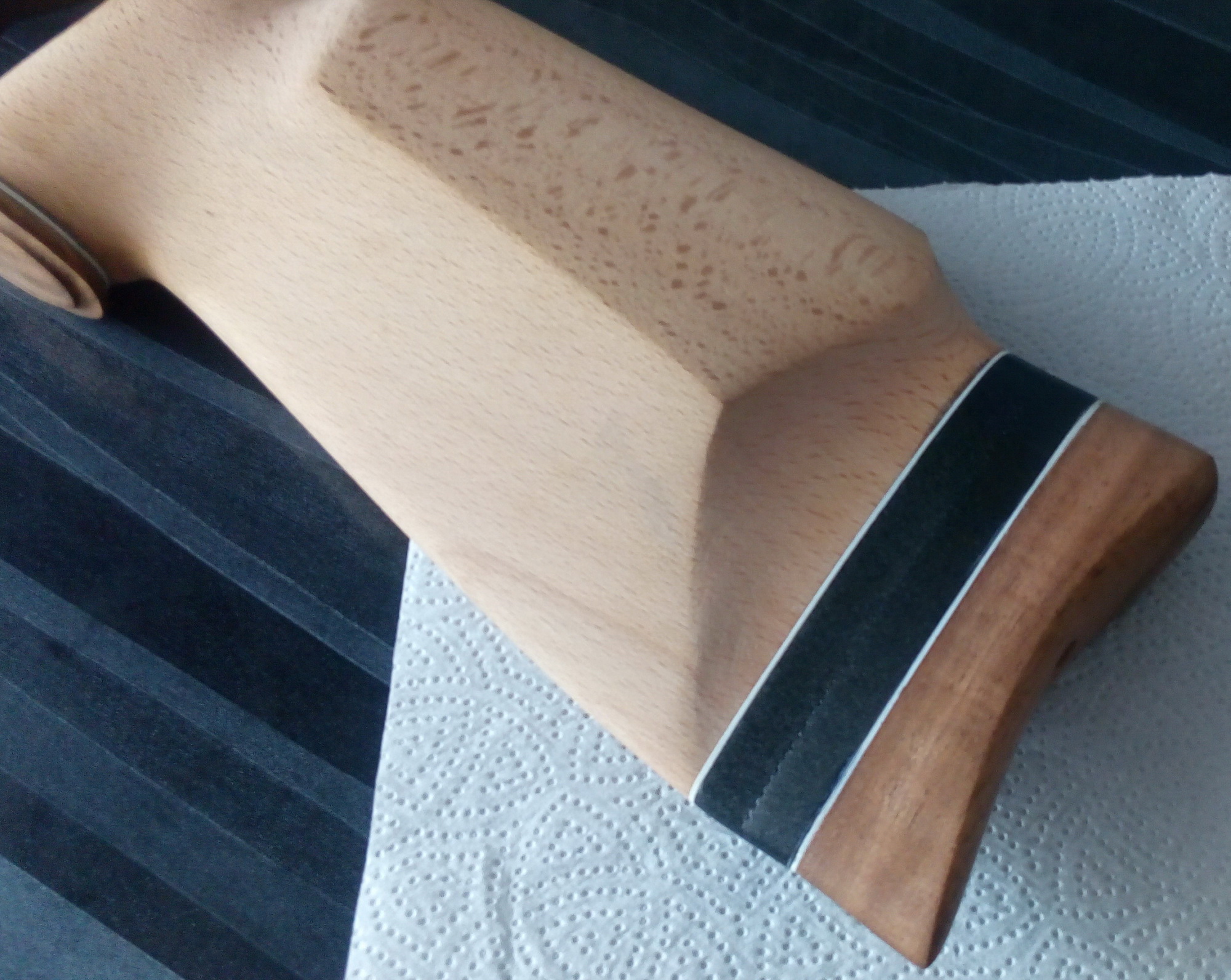 Продолжил декорирование изготовлением пятки на рукоять из той же индийской породы+ также прокладка из такого же пластика. Закрепил пятку на рукояти по отработанной давно технологии-саморез вместо шпильки, отверстие в рукояти, клей ЭДП, струбцина. Вот так всё двигалось: