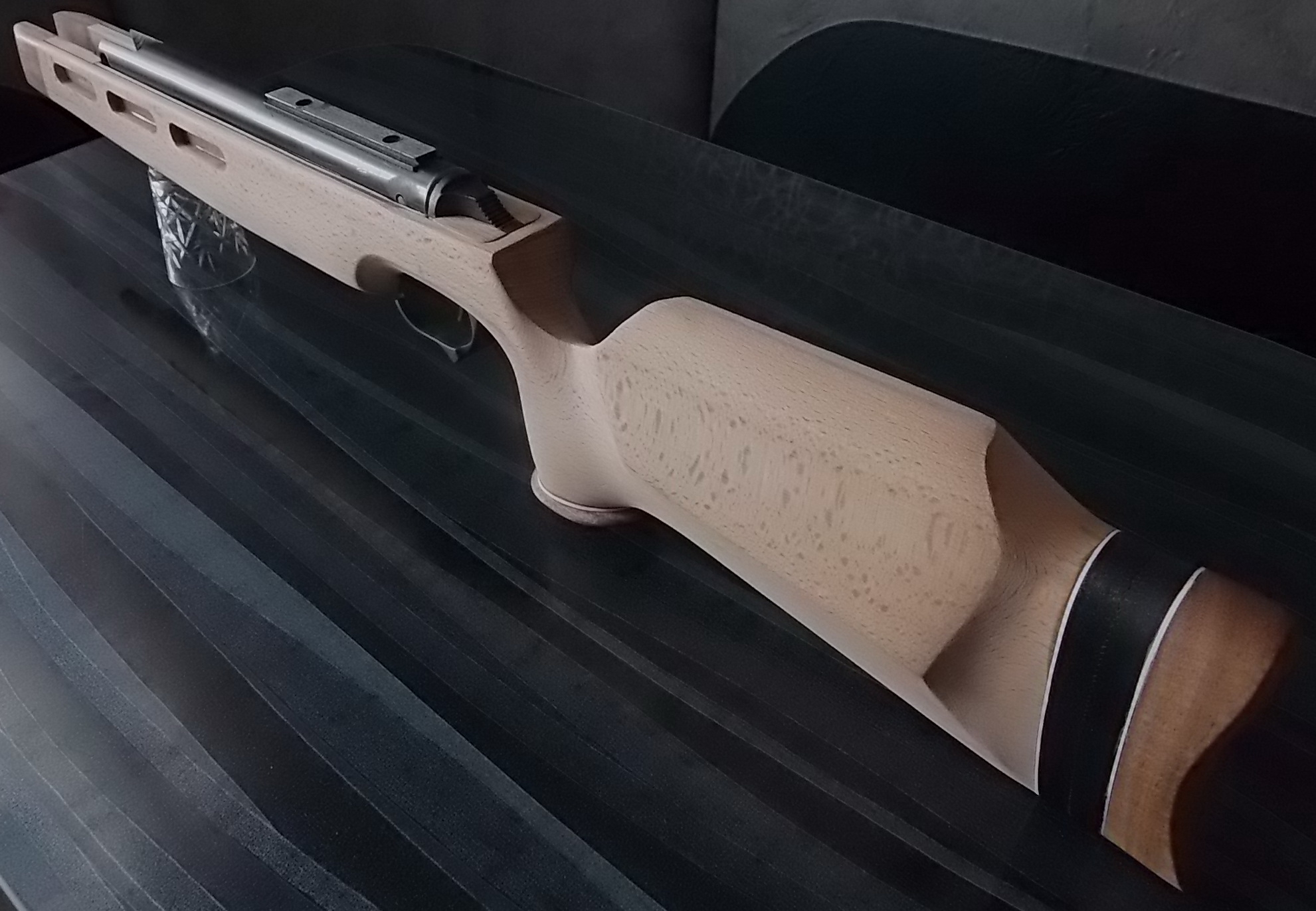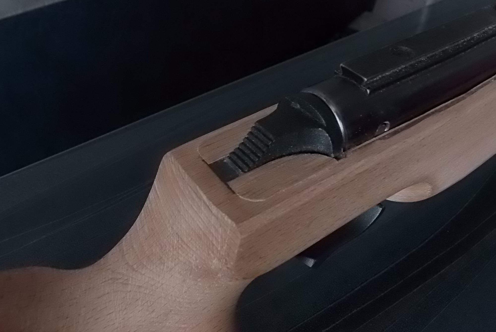 Компрессор отлично упирался в изготовленный вклеенный задник, спусковой крючок с «Муркиным» предохранителем оптимально торчали из спусковой скобы. Наращивать их не пришлось что конечно порадовало. Выходило всё как нельзя хорошо. Приклеенный дубовый шпон хорошо слился с буковой ложей. После зачистки станет ещё лучше! Вот гляньте что у меня получалось на тот момент: