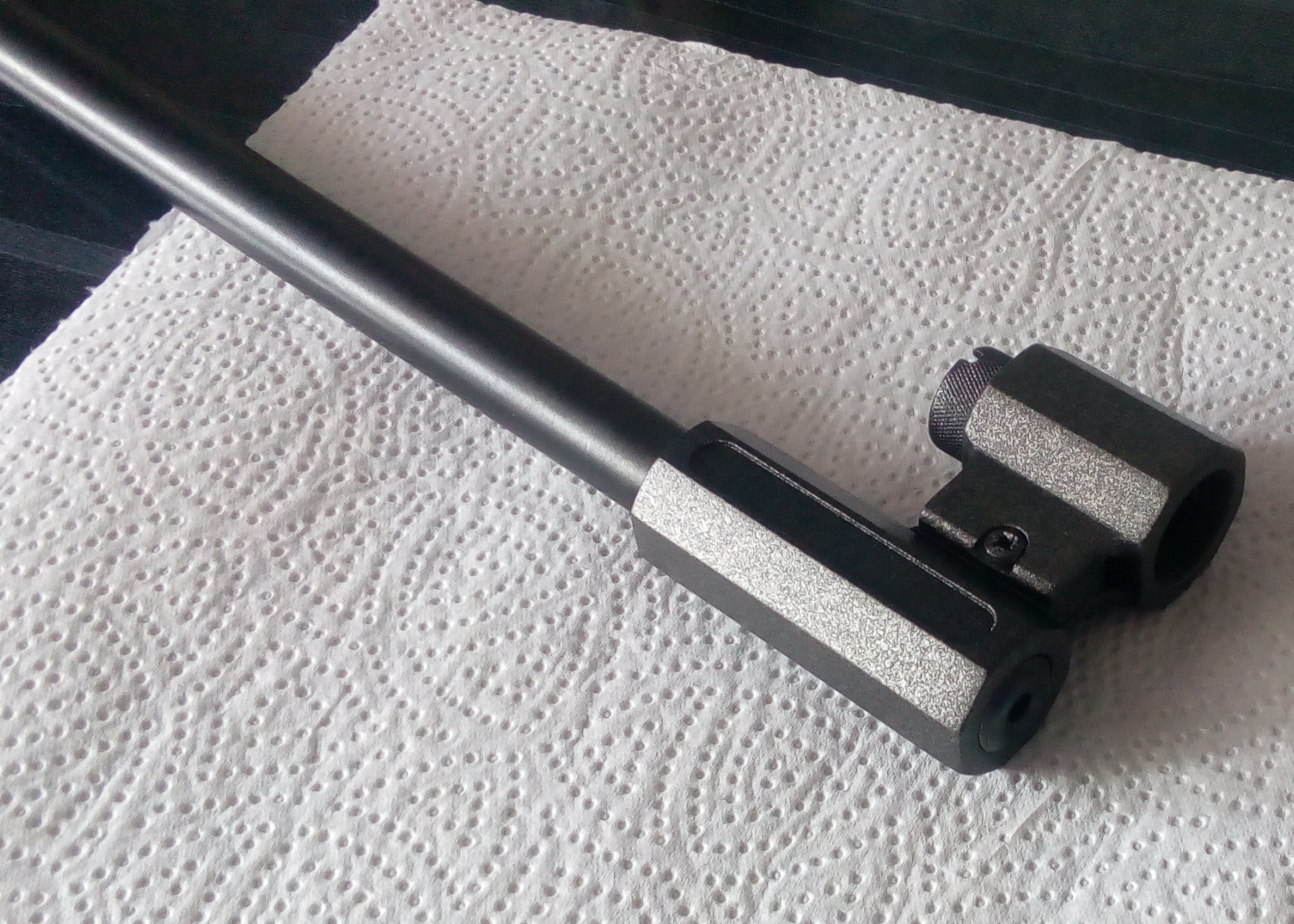 Ну и собственно теперь о намушнике с мушкой! Снова в деле был дружище Руслан. Как и затыльник мушку было решено сделать регулируемой по высоте на таких же «крокодильчиках». Такое же решение применено и на российских винтовках «Пионер». Диапазон поправок по высоте на моём намушнике 12мм. Фиксируется после оптимально подобранной для стрельбы высоты винтиком с гаечкой. Мушка стальная «пенёк» вклеена в намушник на ЭДП. Сам намушник на стволе закреплён на смесь ЭДП с метал.пылью после точных замеров, выверки. Сделан надёжным из прочного пластика и 100% заполнен при печати-литой практически. Окрашен в один тон с задником за компрессором, скобой спусковой и базой затыльника приклада-под металл. Вышло думаю шикарно: