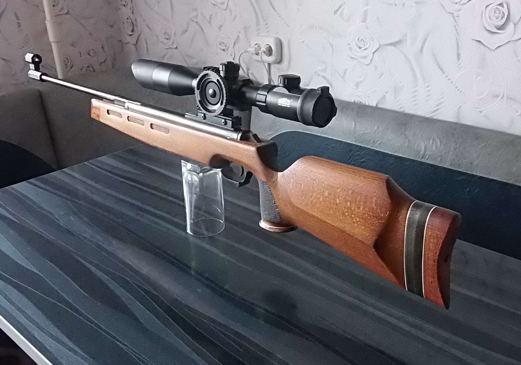 Конечно можно установить вместо диоптра и оптический прицел. Опять же-учитывая высоту мушки и чтобы она никак не маячила в объективе прицела, установить его позволит повышающий переходник. Прицел нужно поставить либо в средние кольца, или как я в моноблок с выносом. Высота щеки на прикладе позволяет весьма комфортно прицеливаться в оптику. Когда сниму видеообзор по этой работе-наглядно покажу вам оба варианта прикладки с диоптром или оптикой. Вот вариант с установленной на винтовку оптикой. Дружок Руслан изготовил мне шикарное колесо отстройки от параллакса-здесь на фото оно ещё не окрашено. Бленду с «козырьком» кстати также он изготовил-уже давненько и потому её я покрасил. Ну пока как есть посмотрите: