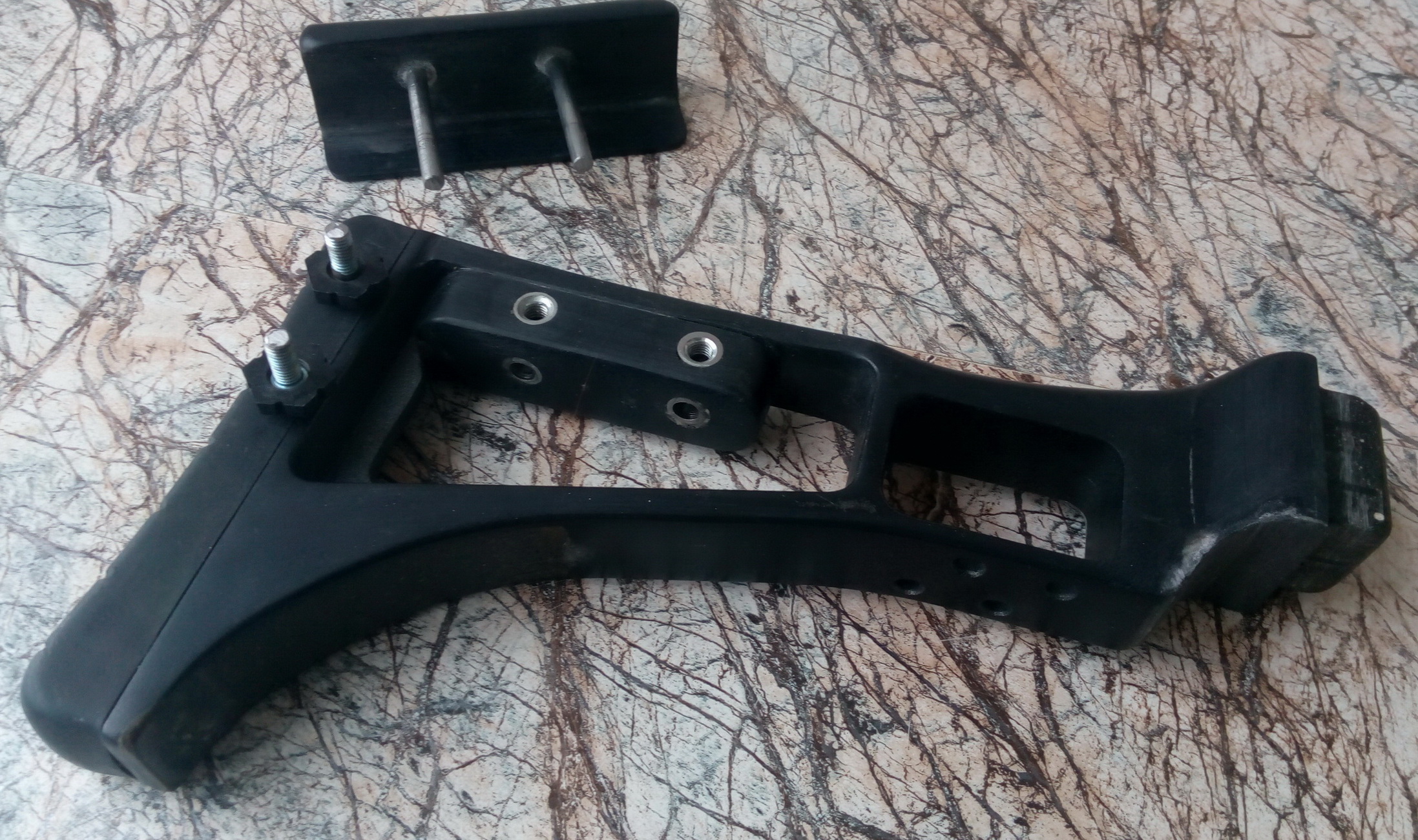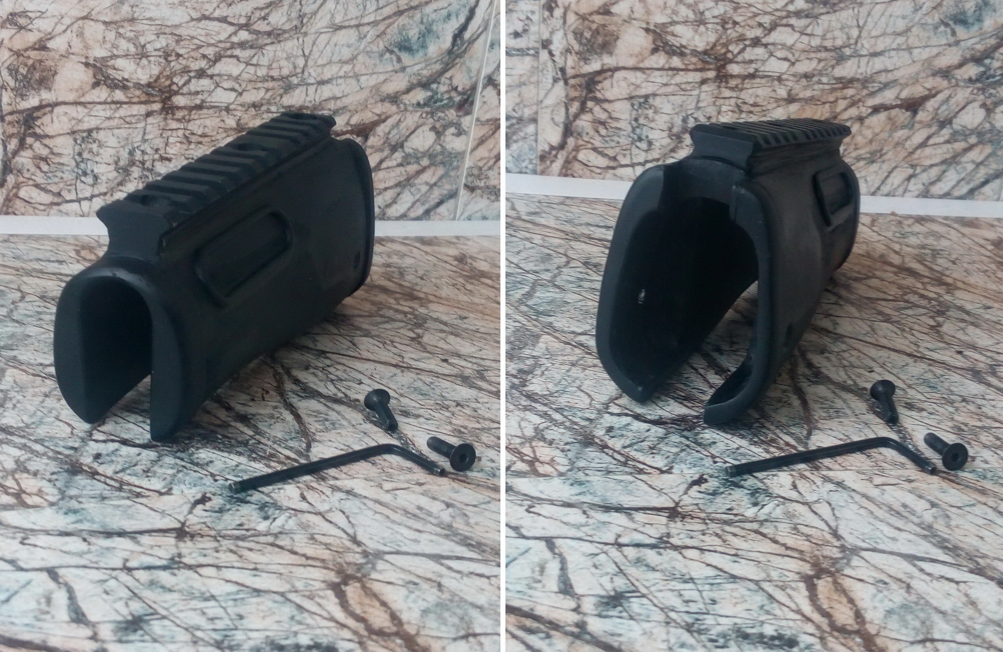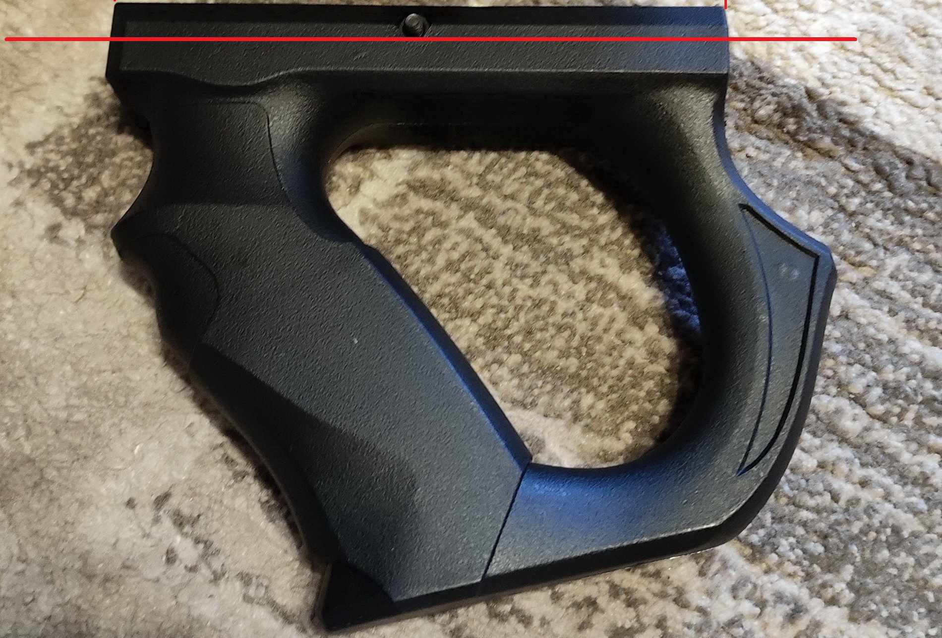 Пришло время рукояти с спусковой скобой. Изначально думал что возьму стандартную эргономичную рукоять АК или AR подобные. Попала мне на глаза на барахолке у одного продавца рукоять переноса огня с крепежом на вивер планку на цевье. Подумалось что именно она может послужить пистолетной рукоятью-больно интересные формы были у неё. В стоковом виде вот такой она была-сверху крепление на вивер. Но после примерки её к ложе выяснилось что слишком низко она из-за этого опустится по отношению указательного пальца к спусковому крючку. Потому спилил я примерно 10мм с верхней части рукояти-т.е. крепёж на вивер я удалил. На снимке отмечено место примерного спила красной линией: