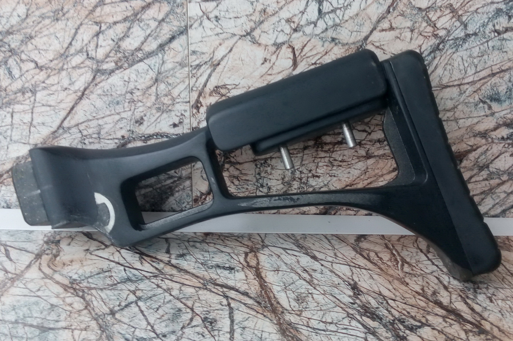 Ну и конечно вы уже с первого снимка рассмотрели регулируемую щеку на прикладе. Да! Решил сделать и её-впрочем оказалось она пришлась весьма кстати на прикладе. Как и для прицеливания по открытому прицелу, так и с коллиматором/оптикой. Щеку собрал из того же прочного чёрного пластика толщиной 3мм. Собирал опять же слоями на цианоакрилатный клей. Затем с помощью абразивов подходящих дорабатывал геометрию. Изготовленная щека оооочень надёжная и уверен в ней на 100%. Также из этого же пластика собрал основу (базу) куда будет вставляться на стальных шпильках эта щека. В базе сделал отверстия под шпильки, отверстия под втулки резьбовые с маховиками. В отверстия под шпильки врезал на клей две стальные втулки-т.е. шпильки двигаются в основе не по пластику, а по этим втулкам. Сбоку врезал на клей мебельные стальные втулки М6-маховики резьбовые с чёрными декоративными шляпками-также мебельные. Стальные шпильки на одном конце имеют резьбу, потому в щёку они не просто вклеены хвостовиками, а в щеке в приготовленных отверстиях была нарезана ответная резьба М6 и шпильки были врезаны по резьбе в щёку на ЭДП. После застывания клея благодаря прочности пластика и клеевого состава шпильки намертво вросли в щёку приклада. Базу притянул к прикладу двумя саморезами на клей ЭДП. Головки их после застывания клея я зашпаклевал смесью цианокрилата+пищ.сода и аккуратно зачистил наждачками. Вот итог: