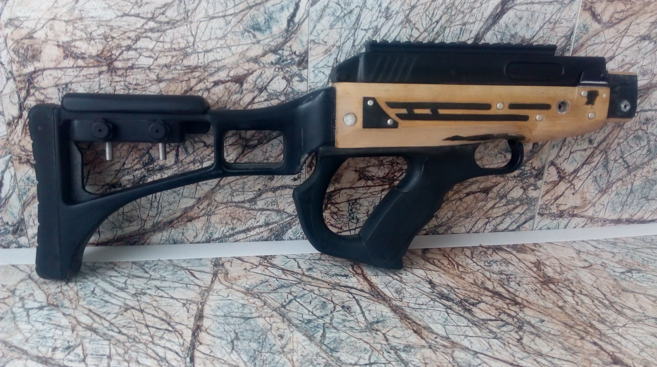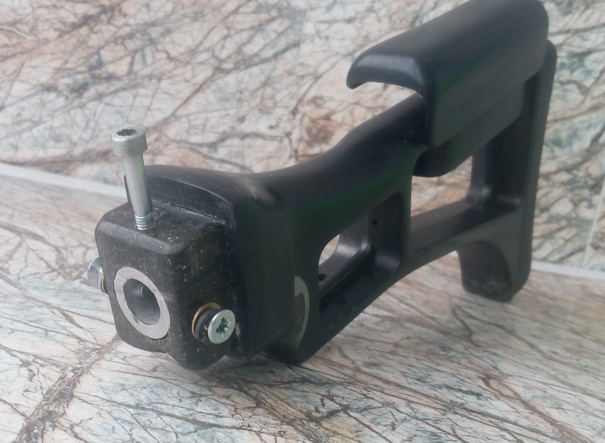 Приклад в выбранный под него паз садился довольно туго, но чтобы крепёж его в ложе был бы ещё надёжнее-решил по бокам просверлить сквозные отверстия через ложу, пластиковый шип в алюминевую трубу. Нарезал в этих отверстиях резьбу М5. Также сверху по центру ложи сделал ещё одно такое же отверстие и нарезал такую же резьбу М5-это для крепления крышки ствольной коробки. О ней расскажу чуть позже. Так при вклеивании приклад можно будет надёжно зафиксировать винтами что не даст ЭДП выдавить вставленный в паз приклад и не образуются щели. Да и резьба нарезанная в трубке даст после затяжки крепёжных винтов 100%-ную прочность. Так что трубу не напрасно я всё-таки вклеил в приклад)))))))))) Примерно так всё было: