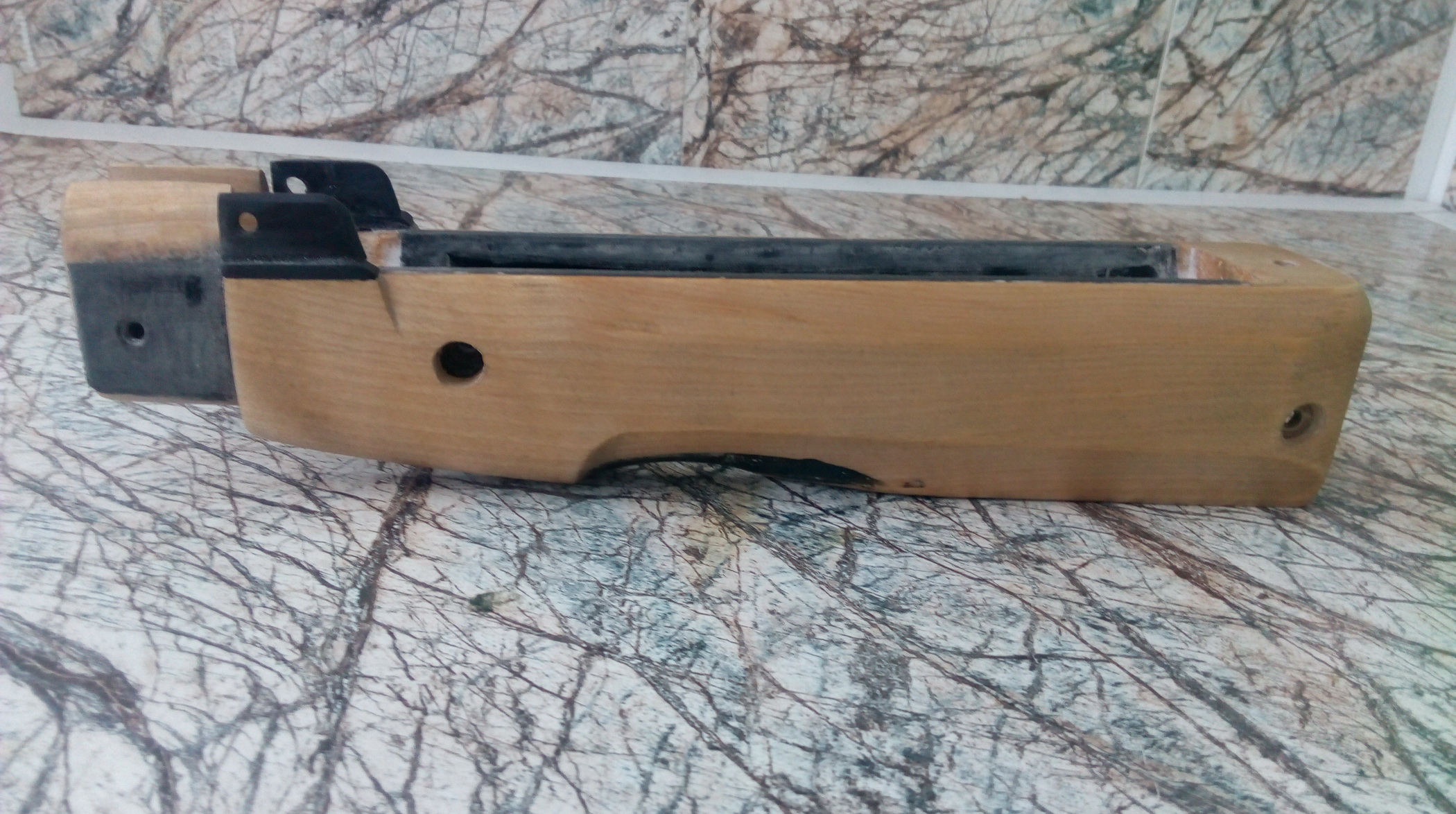 В задней части изготавливаемой ложи сделал необходимый для вклейки и фиксации приклада паз под тот самый алюминевопластиковый шип в передке приклада: