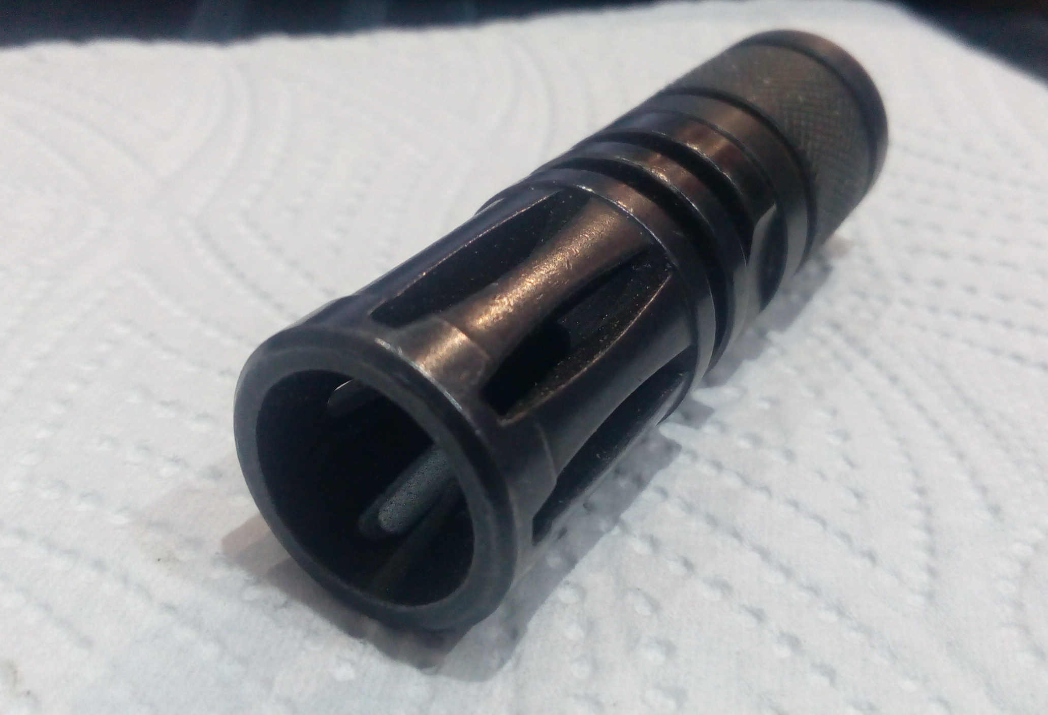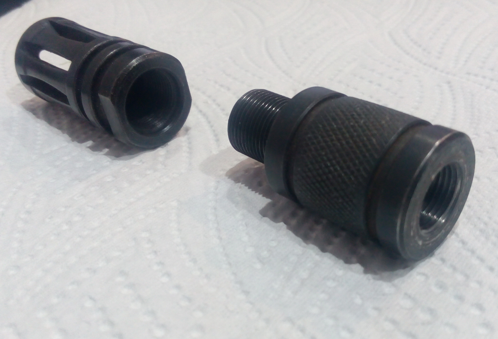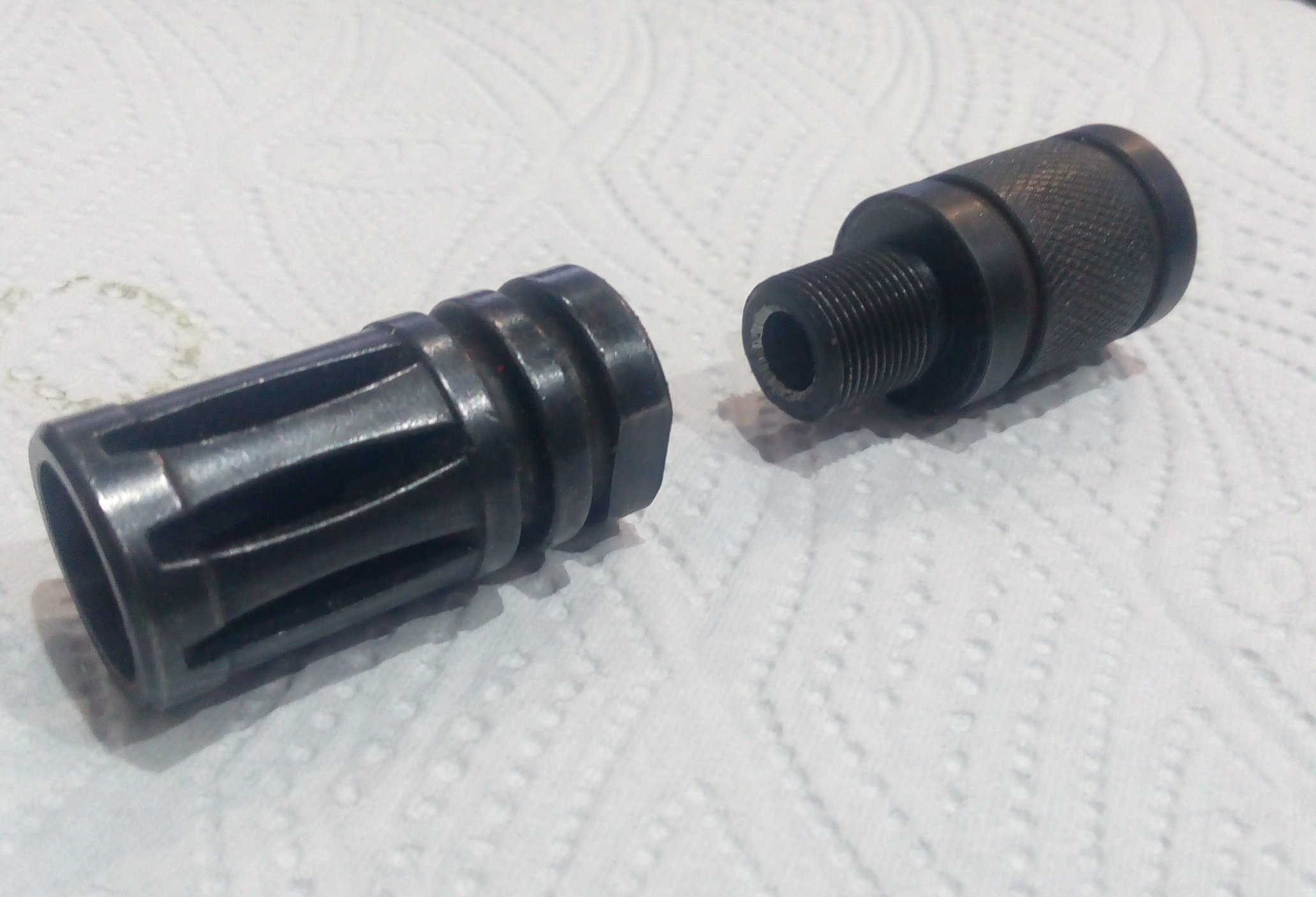 Ствол пистолета решил сделать потолще-больно тоненьким он выглядел. Для этого подобрал годную медную трубку-она в натяг одевалась на ижевский ствол на ЭДП. Подходящей стальной или алюминевой трубки увы не отыскал, но и медная вполне годна, тем более вес её вообще практически не изменил веса пистолета. На дульный срез изготовил стальную втулку с внешней резьбой М12Х1. Закрепил эту втулку надёжно на кончике ствола на суперклей+пищ.сода. Нашёлся годный для проекта ДТК от AR-15. Чтобы накрутить его на ствол «Ёжика», изготовил стальной переходник с резьбы М14 на М12Х1-ту самую резьбу что на втулке на стволе. Вышло неплохо я так думаю: