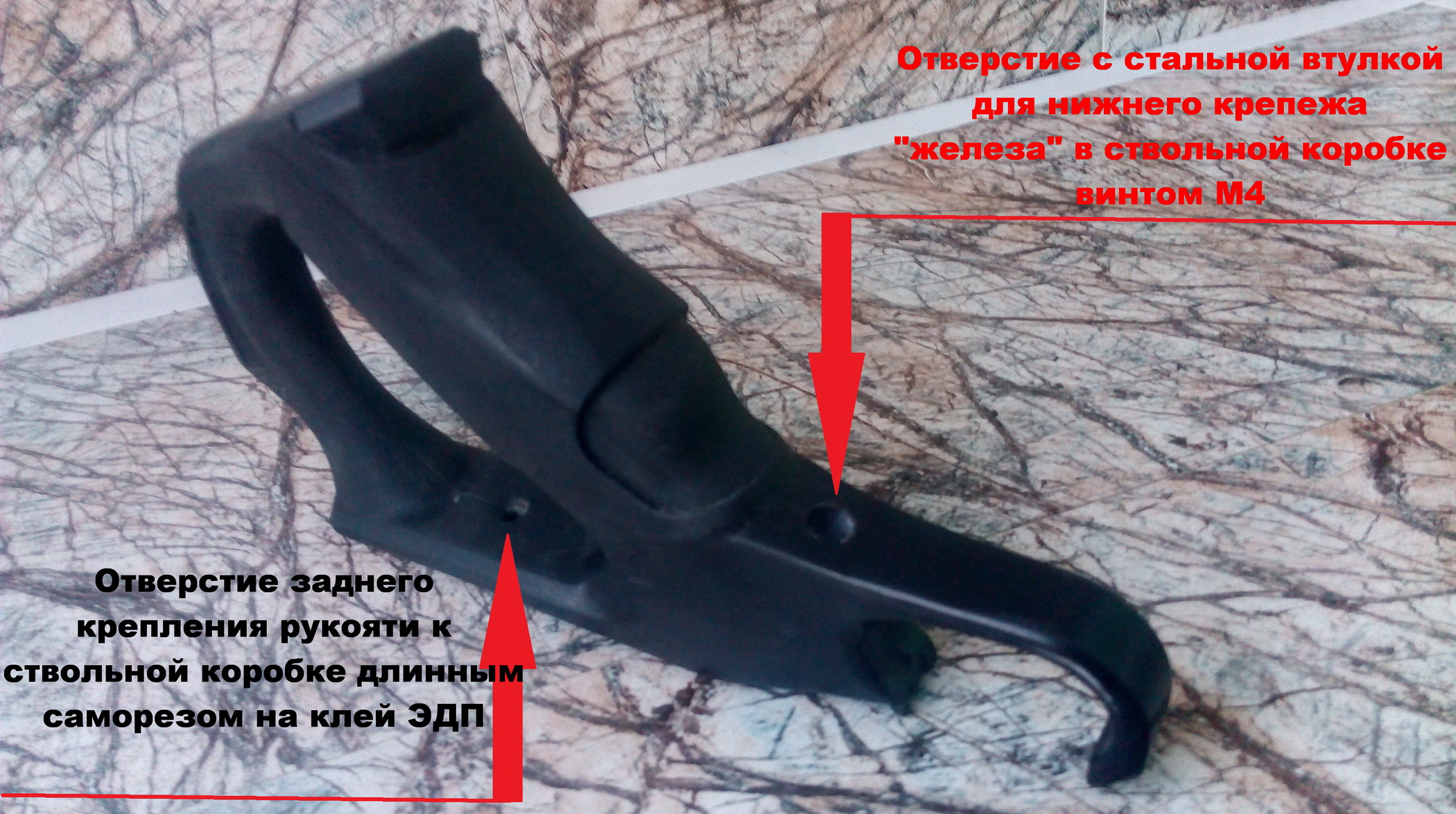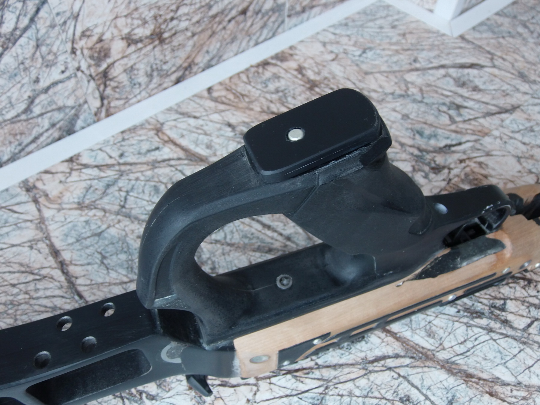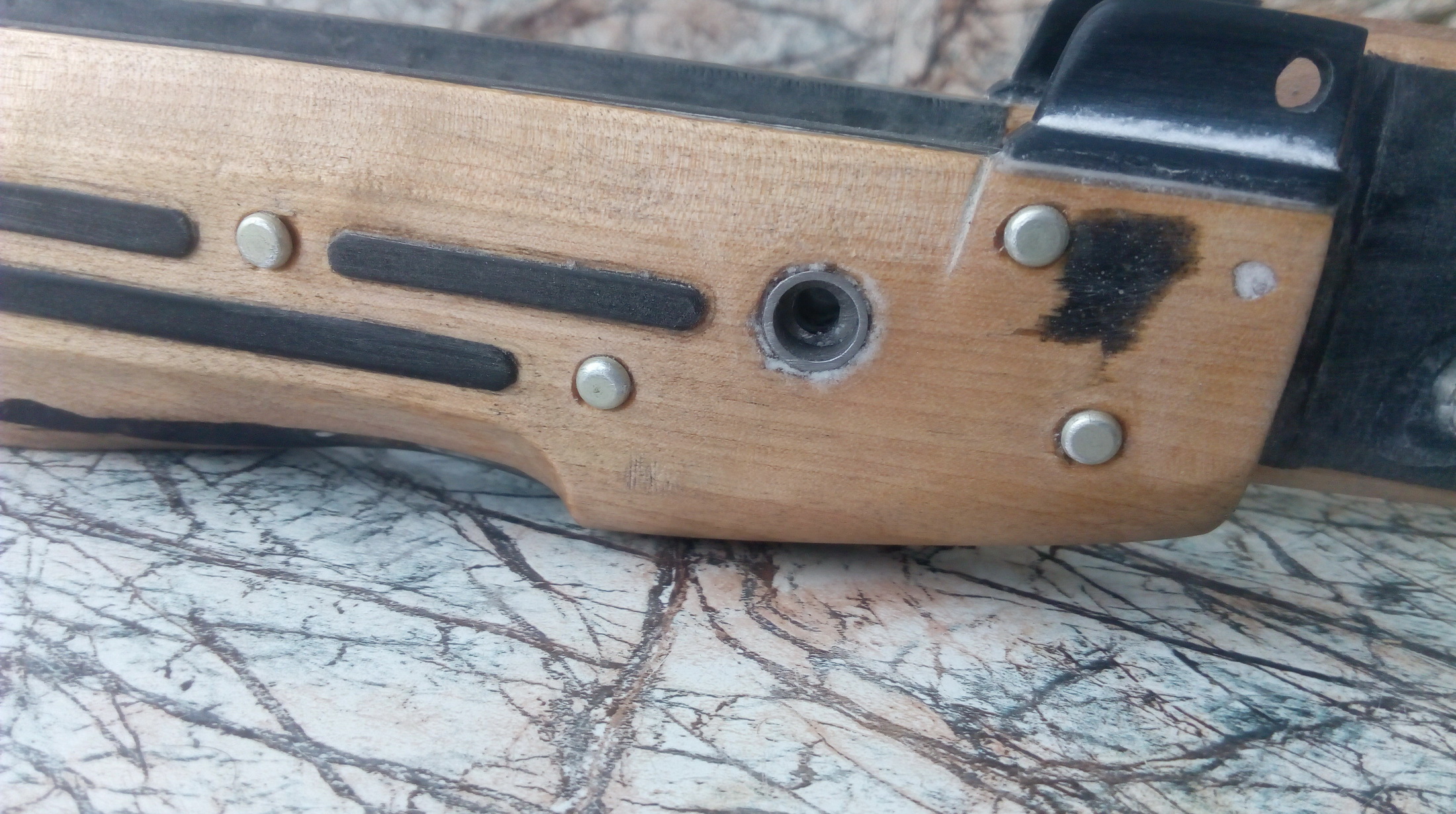 Примерил снова-отлично!!! Пластик плотный и закрутить в него саморез длинный в предварительно засверленное под него отверстие было возможно. Т.е. сверху впереди один саморез через ложу в пистолетную рукоять, второй длинный саморез примерно посередине перемычки закрутить через перемычку в ложу, при этом шляпка самореза пряталась разумеется в этой перемычке чтобы не натирала руку при хвате. Аккуратно насверлил по 2 нужных отверстия в рукояти и ложе. Чтобы спрятать головку самореза в перемычке (сверлить под неё было невозможно)-я нагрел на газовой горелке саморез и вставив его в отверстие с нужной стороны, плоскогубцами втиснул его в перемычку горячим на нужную глубину. Вытащил саморез, после остывания обуглившиеся края отверстия(зенковки под шляпку) аккуратно обработал напильником мелким и бумажками. Вышла аккуратная луночка под шляпку самореза. И используя всевозможный пластик сделал спусковую скобу симпатичную, наклеил по бокам верха рукояти стенки из тонкого пластика-предварительно разогревая выгнул их необходимой формы и вклеил сделанную спусковую скобу. Собирал всё на цианокрилат. Закрепил рукоять со скобой на ложе двумя саморезами-под спусковую скобу в ложе выбрал необходимые формы для вклейки краёв, сделал метку для сверления нижнего крепёжного отверстия «железа» в ложе. Просверлил его-всё совпало точно. Вставил в пустотку между приклеенными стенками от рукояти к скобе пластиковую трубку строго по центру просверленного крепёжного отверстия. В трубку вставил стальную втулку под крепёжный винт М4-она не даст при затяжке винта продавить пластик и древесину. Трубку с втулкой приклеил торцом плотно к ложе. Это чтобы выставить её точно под крепёжный винт и чтобы не пролился внутрь заполнитель. Заполнить оставшуюся пустоту решил смесью клея ЭДП и мелкой пластиковой пыли. Ну и после высыхания всё обработал, подогнал одно к другому. Вот такая рукоять со скобой у меня вышли: