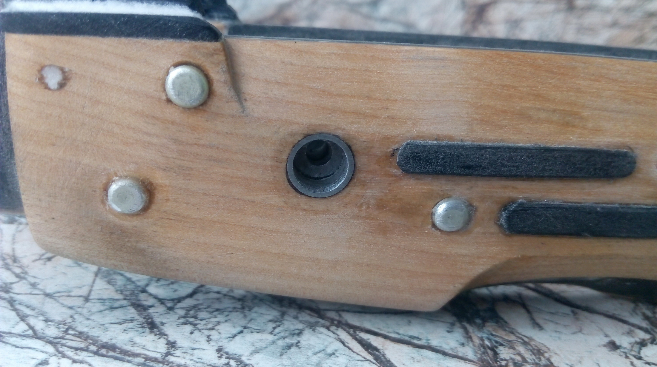Как видите некоторый рельеф уже на ложе доработан. Мудрить особо не стал-чем меньше «завитков», тем меньше ненужного. Единственное-это решил сделать некую имитацию штампованной ствольной коробки с элементами из пластика тонкого и дюжиной заклёпок, которые вклеил в отверстия на супергель. Разумеется когда всё будет чёрного цвета, то конечно же вид изменится и не будет таким пугающим…. Ну а для боковых винтов которые будут крепить «Ёжика» в ложе, я изготовил пару стальных втулок и врезал их на клей в ложу. Так при закручивании и подтяжке крепёжных винтов, их головки не продавят древесину и крепёж будет надёжнее не придумаешь. С декором на тот момент было закончено, втулки на месте и теперь к вклеиванию приклада в мою ложу всё готово. Приливы крепления крышки ствольной коробки для большей надёжности я укрепил смесью суперклея и пищ.соды-как камень состав!