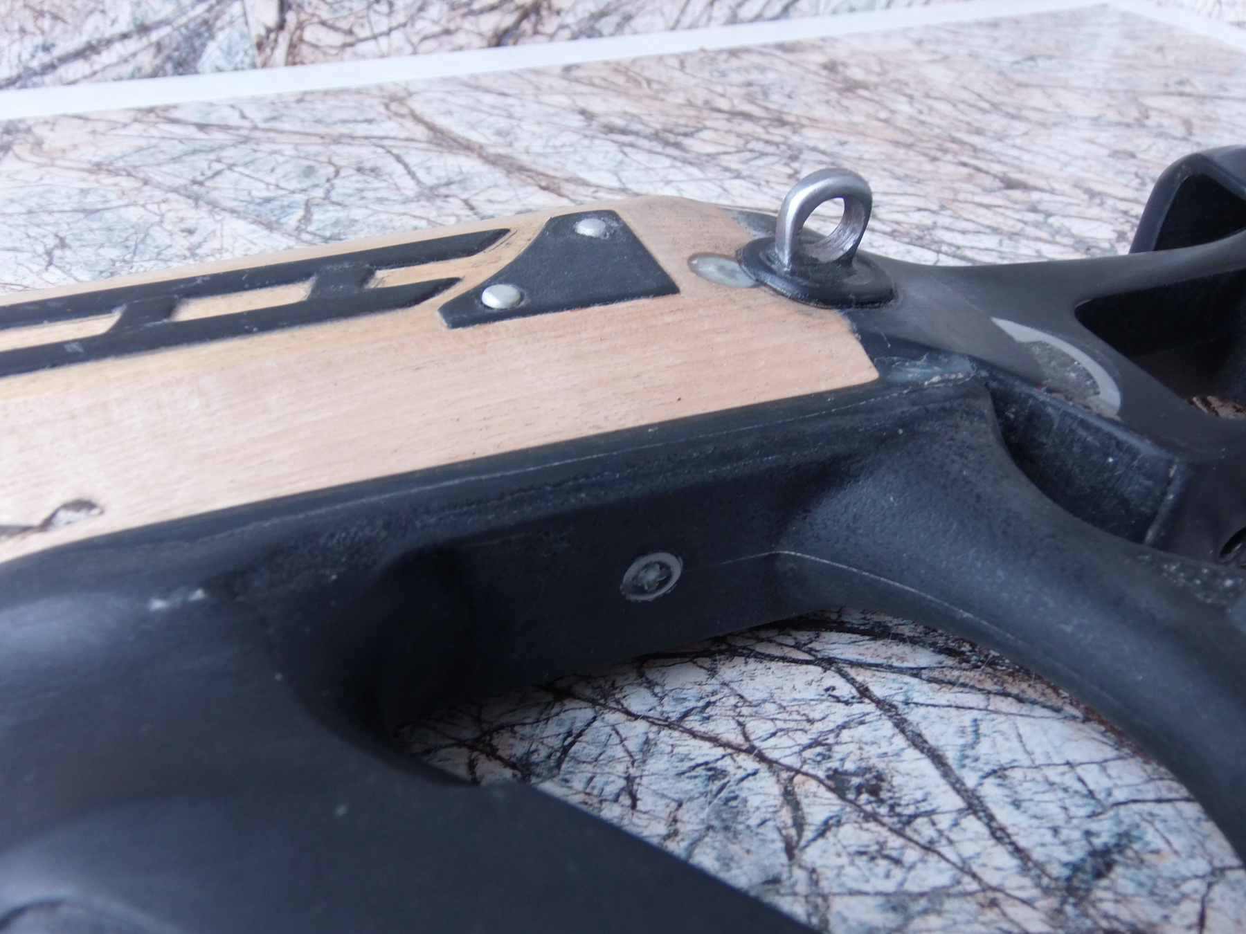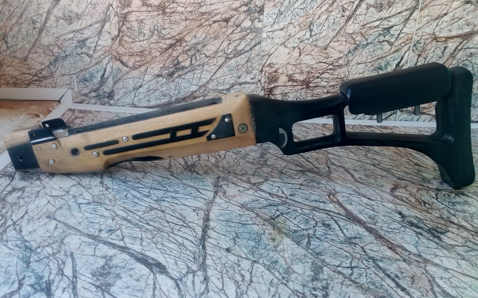 После вклейки приклада на ЭДП+по винту М5 по бокам, высыхании основательном-аккуратно подвёл абразивными бумажками разной зернистости приклад к ложе, т.е. слил их воедино. Результат-щелей нет: