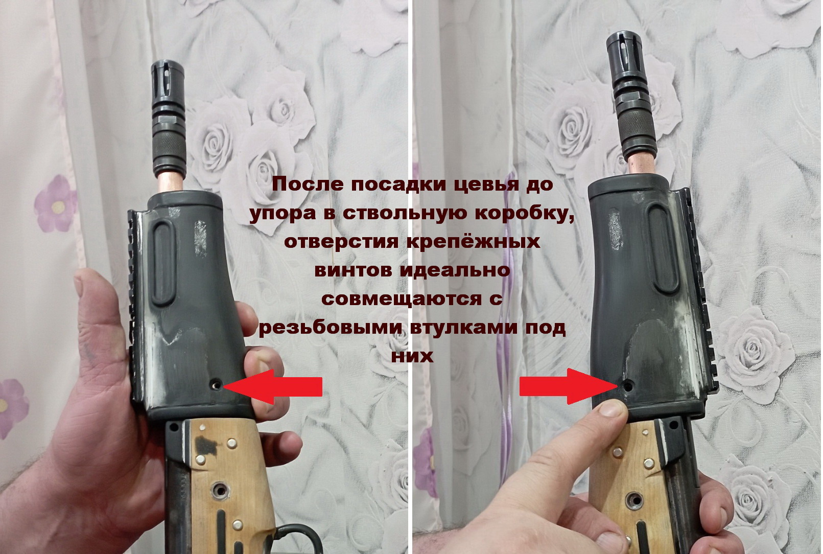 Когда рассказывал про цевьё-обещал показать принцип его крепления. Вот наглядно поэтапная установка цевья на изделие. Ничего сложного-буквально 3 секунды и оно на месте, затем останется закрутить ключиком два винта крепления в боковины цевья, ну это уже не фоткал)))))))