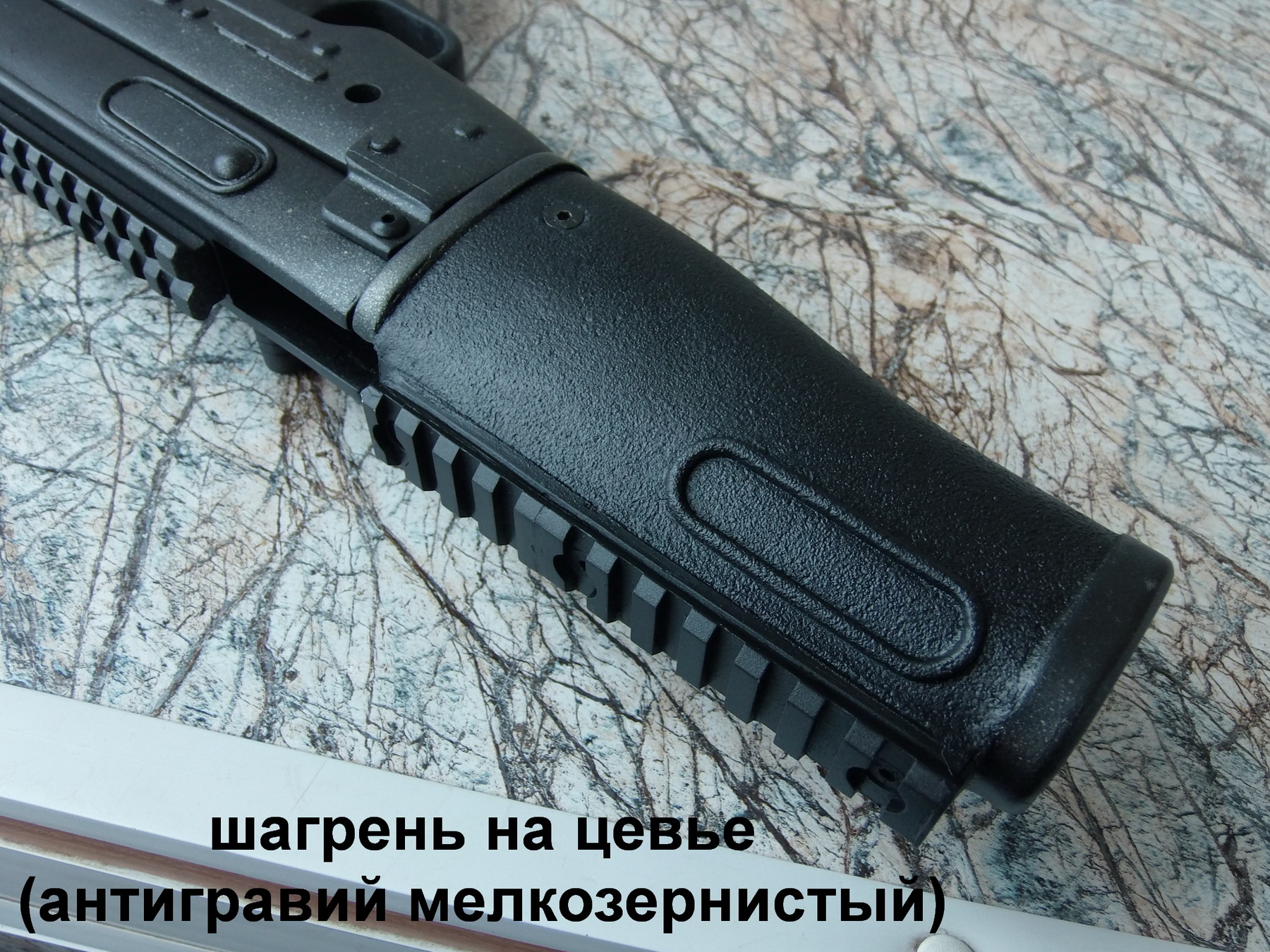 Больше никаких дополнений решил не делать-всё необходимое было. Перед окрашиванием шпильки регулируемой щеки, антабка стальная под одноточечный ремень и головки пары оцинкованных крепёжных винтов были обработаны средством для холодного воронения «Клевер». Осталось всё чуток подчистить наждачкой и приступать к грунтованию модулей моего «пистолета-пулемёта». Грунтовал аэрозольным серым эпоксидным грунтом. После грунтования заматовал всё с помощью наждачки Р600, смачивая её в воде. Продул всё хорошенько воздушным пистолетом, обтёр насухо. Решил для удобства хвата сделать некоторый участок на пистолетной рукояти с пористой фактурой. Также решил цевьё доработать в том же стиле, только его полностью снаружи сделать с такой фактурой. Конечно же оковки цевья были оставлены гладкими-оклеил их перед окрашиванием. Разумеется и планка вивера оставалась гладкой-её заклеил сразу малярным скотчем, скотчем оклеил и пистолетную рукоятку-там где фактурное покрытие не планировал. Ну и конечно резиновый затыльник приклада нужно было подчеркнуть ещё лучше-сделать его также красивым фактурным. Для декоративной фактуры этих элементов снова использовал как обычно аэрозольный мелкозернистый автомобильный антигравий. Много раз я его применял для таких покрытий и никогда он меня не подвёл. Наносится неспешными пшиками с большого расстояния (примерно 50-60см от баллона до окрашиваемой поверхности) в два подхода. В результате после основательной сушки получается весьма шикарное стойкое к истиранию шагреневое покрытие. Руки на нём не скользят, да и на ощупь руке очень приятная фактура. Приклад в плече располагается надёжно. Ну а после уже перешёл непосредственно к покраске всего набора деталей аэрозольной матовой чёрной краской, также в два слоя. После суточной основательной сушки краски, для придания металлического эффекта ствольной коробке, крышке ствольной коробки, прикладу и регулируемой щеке-натёр эти детали графитовым порошком. Это ещё лучше имитировало металлический вид узлов «Ижика». Порошок наскоблил ножом с тёмно-серых графитовых щёток от какого-то электродвижка. Нанесённую краску и графитовый порошок закрепил слоем матового аэрозольного лака. В результате после сборки вышло так: