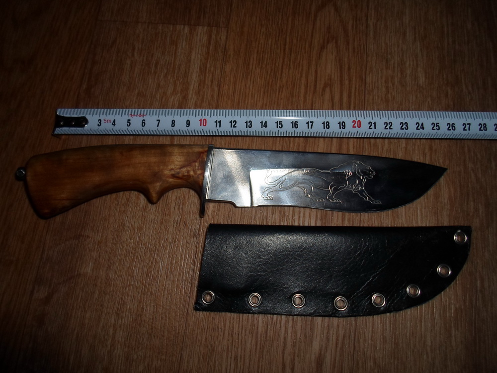 Сталь Х12МФ,гарда нержавейка,рукоять карельская берёза,монтаж сквозной. На всякий случай.