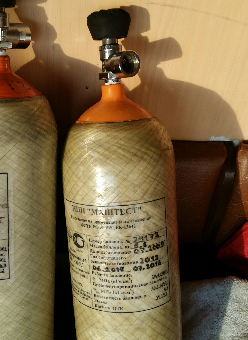 Металлокомпазит Маштест вес 4.6кг 2009года опресован на 3и года как положено состояние - почти новый как с наружи так и изнутри, вентель мягкий, забит на 300атм и готов к использованию. Фото выше его.