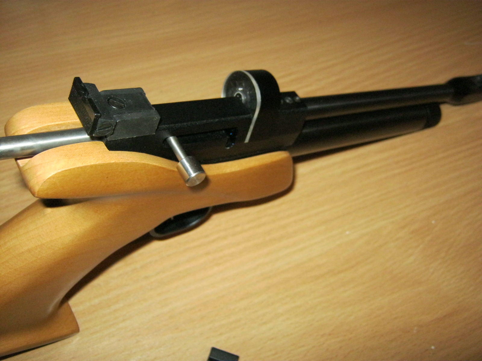 М наверное модернизированный, барабашка родной металлический, на 9 пуль, и есть родная полка для однозарядной стрельбы, полка тоже металлическая.