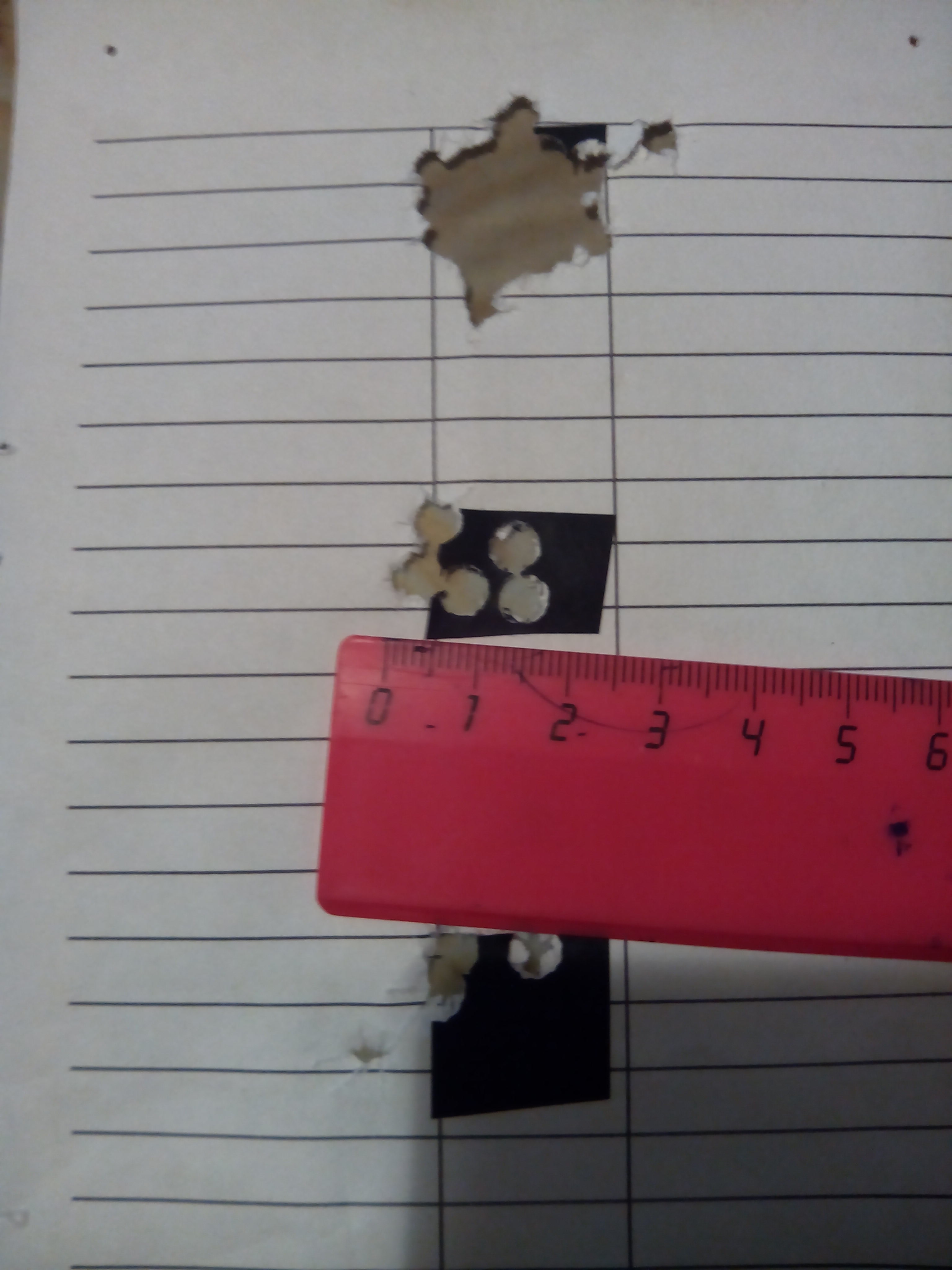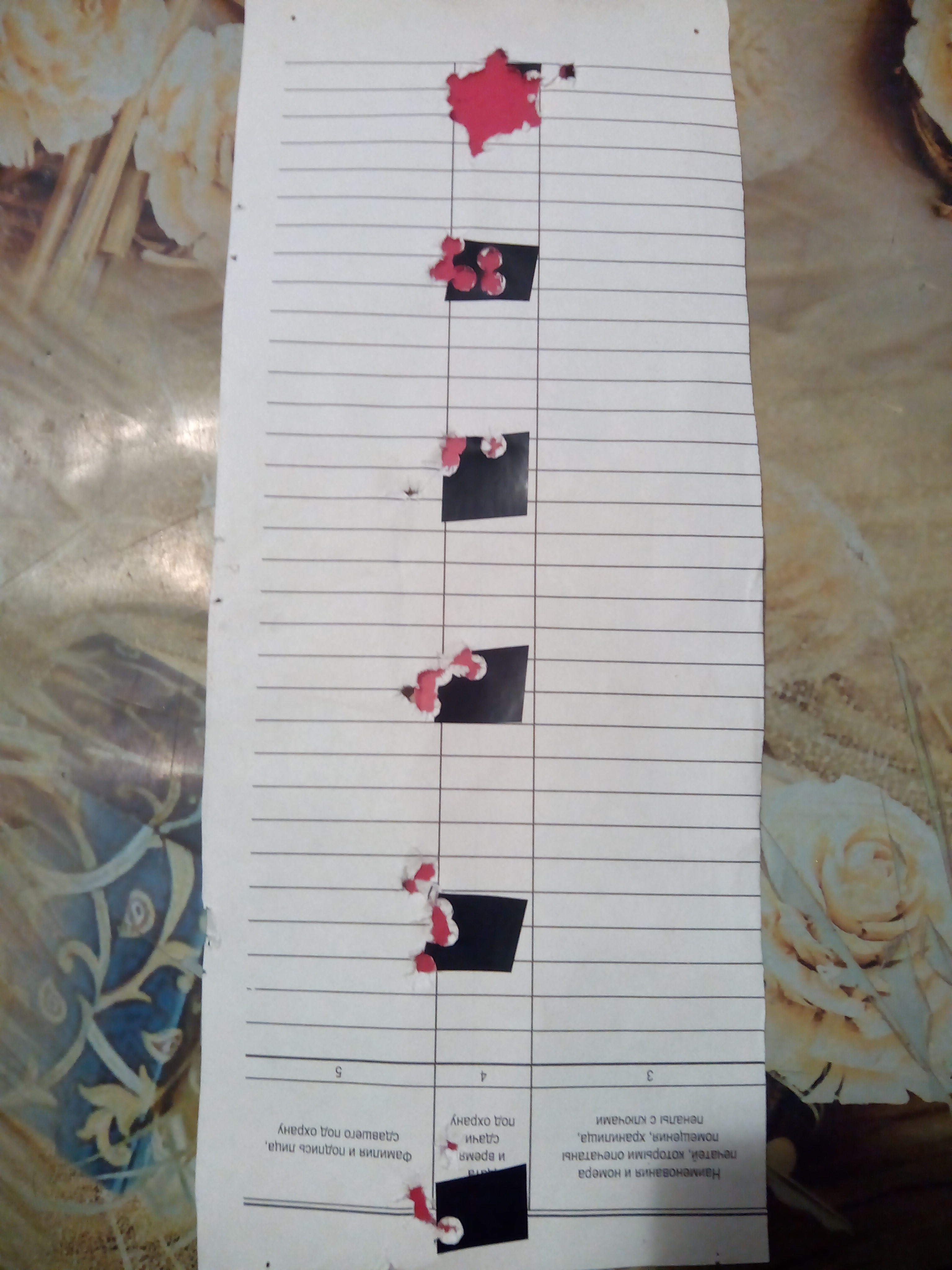 Наковырял тут для наглядности кучек, если так это можно назвать. Условия: улица, 5,0 м., упор-свернутая куртка на капоте. Ну не умею я красиво стрелять по бумаге :cry_ing: