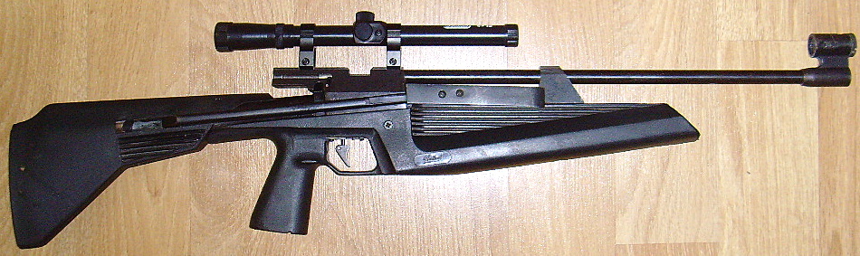 Отсутствует винт регулировки длины приклада, прицельная планка, мушка, пластмассовая заглушка приклада со стороны плеча.