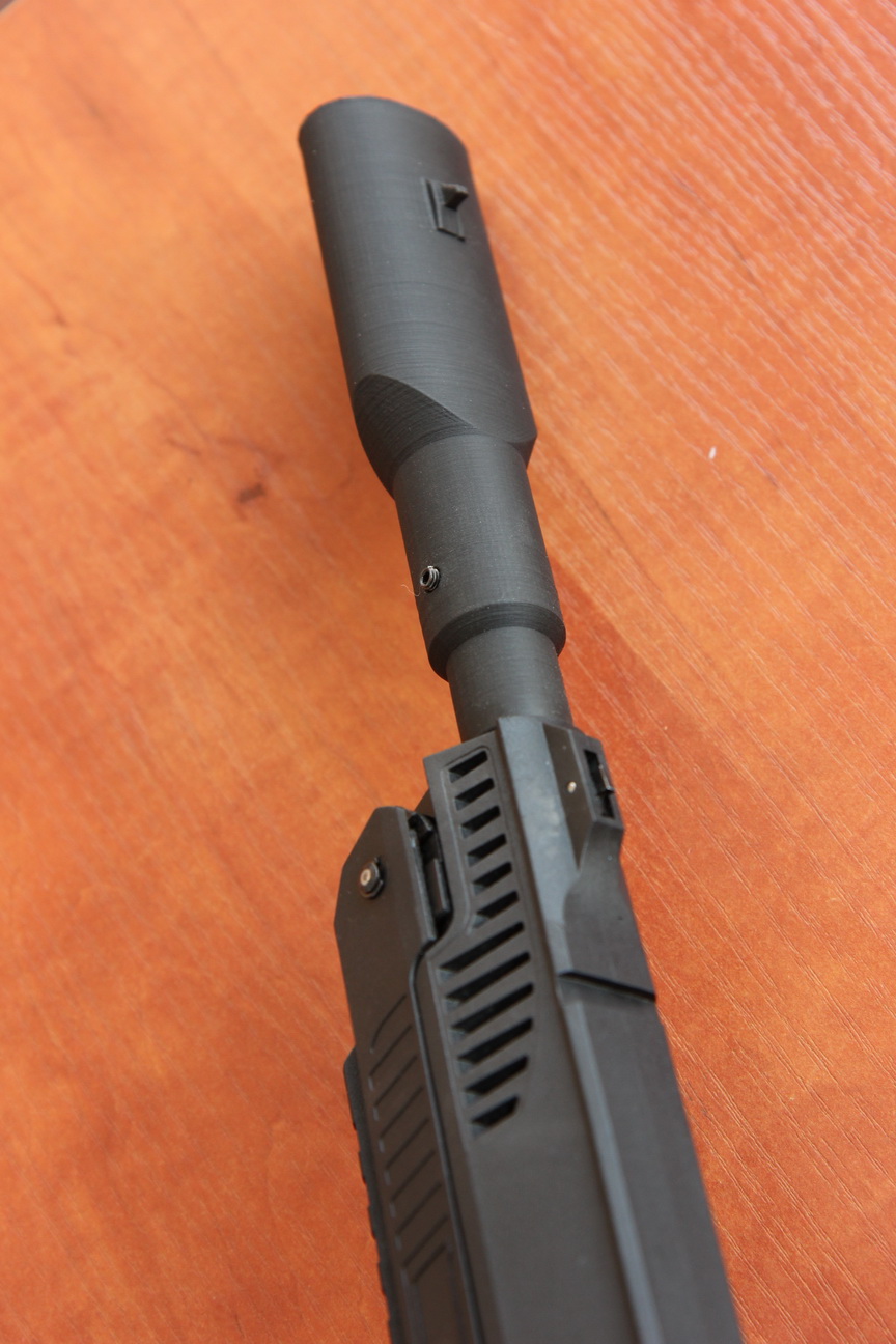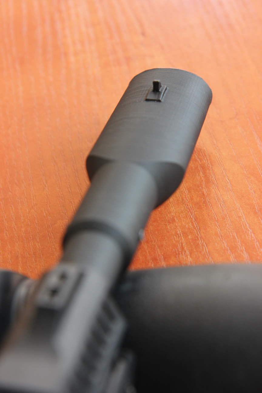Установлен эллипсоидный модер с мушкой, так как я приверженец стрельбы с открытых. Хотя такой мощный девайс конечно просит калик или оптику, но я это не использую.