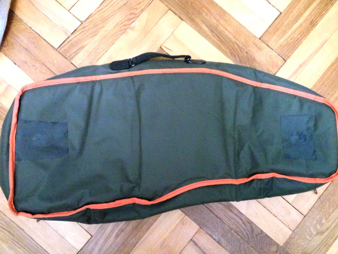 Размеры внутри: 85см х 35см. Ткань плотная, похоже на кордуру. В стенках вспененные пвх вставки, форму держит хорошо. Есть следы ремонта. Была вырвана наплечная лямка, места на спинке от нее "заглушены" вклеенными кусками ткани кордуры такой же почти по цвету. Лямку отдам, мне она была не нужна, поэтому благополучна лежала на полке. 20р.