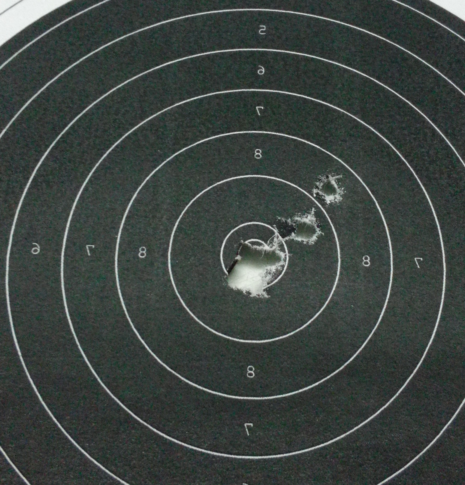 Ваша мишень слева. Кучность не очень. Постарайтесь выжать из винтовки всё, что она может дать на дистанции 10 метров. У Вашей винтовки пули должны ложиться в квадратик 10х10 мм. Я стрелял из SUHL-311, которой лет 40.