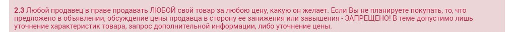 2.3 Любой продавец в праве продавать ЛЮБОЙ свой товар за любою цену, какую он желает. Если Вы не планируете покупать, то, что предложено в объявлении, обсуждение цены продавца в сторону ее занижения или завышения - ЗАПРЕЩЕНО! В теме допустимо лишь уточнение характеристик товара, запрос дополнительной информации, либо уточнение цены.