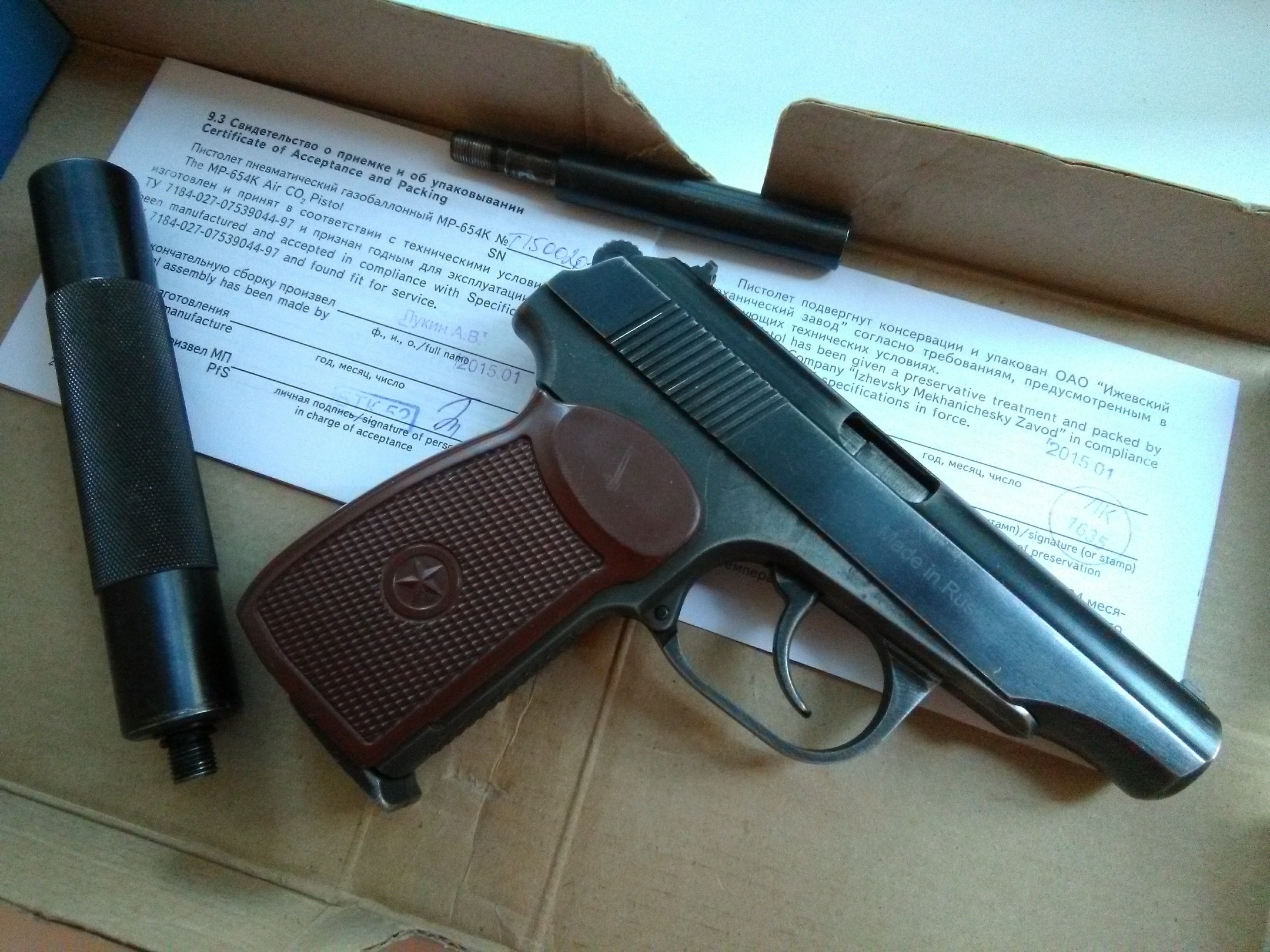 Продам безбородый МР-654К 2015г.в,паспорт и коробка в наличии.Курок без пропила,гайка ствола без зацепа,корпус клапана без паза.Установлен гладкий разборный удлинитель ствола от Петра с фторопластовой прокладкой.Родной нарезной ствол в комплекте.