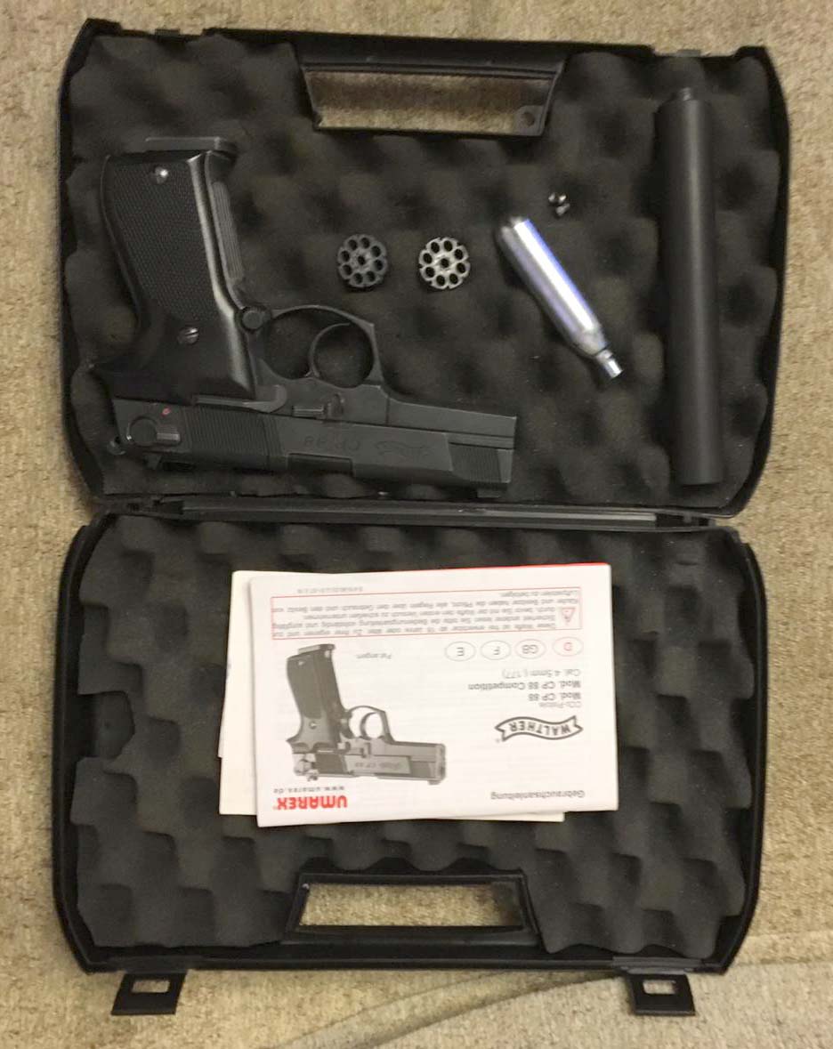 Продам пистолет Walther CP88. Комплект: Пистолет, кейс, документы, два барабана, саундмодератор и болончик. В общем все что на фото. На правой накладке рукоятки, есть небольшая чуть заметная трещинка, у верхнего винта(так продали), я её заклеил изнутри. В остальном проблем нет. Цена 250р. Характеристик в интернете полно, перечислять не буду. Из особенностей, силумин поджима баллона, заменен на дюраль.