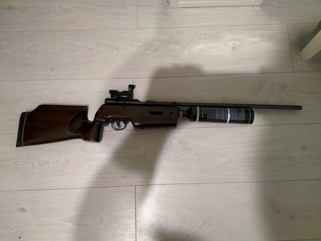 Комплект для бесконечной и почти бесплатной стрельбы)): Винтовка; инструкция; прицел; колиматорный прицел; "ласточкин хвост" для крепления оптики; резиновый затыльник; адаптер под СО 12гр; РОДНОЙ (достал с большим трудом) баллон на 9 унций; переходник на заправку его от огнетушителя (заказывал у токарей); огнетушитель(заправленный); противоударный чехол; пули, баллончики, набор для чистки, запасные уплотнительные резинки. Проведен легкий АП.