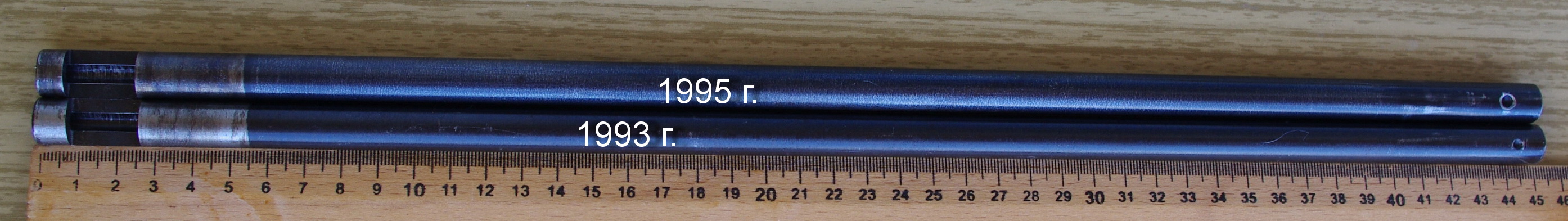 Дополню. Продам стволы из предыдущего пучка ИЖей. Стволы выпрессованы из металлических ствольных коробок ИЖ-60 1993 и 1995 годов выпуска. Стволы без ржавчины, с естественными потертостями воронения при пользовании. Нарезы полигональные, резкий заход пульки на нарезы, тугой чок, фаски-вёдра и мелкие шероховатости – всё заводское. По 40 руб.