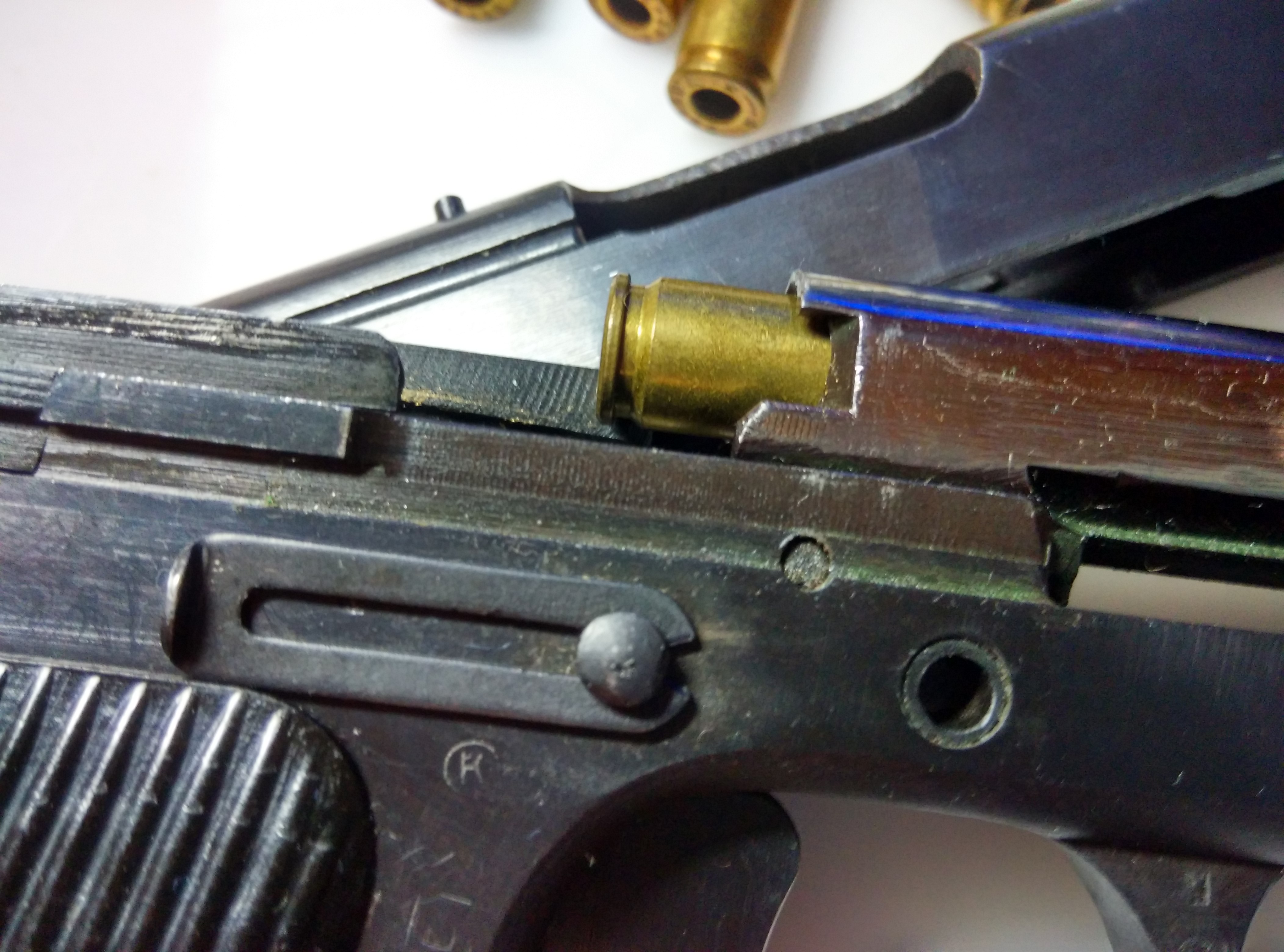 По, ходу, не много не так! Ствол ТТ-С - болванка, не проходная!!! Отверстия сквозного нет! Из патронника есть маленькая дырочка внутрь кожуха затвора, куда и летят все газы и сажа от капсуля. У меня макет ТТ-го патрона не заходит в патронник! :uch_tiv: :dr_ink: :gar_mo:nist: :ko_re:sha: