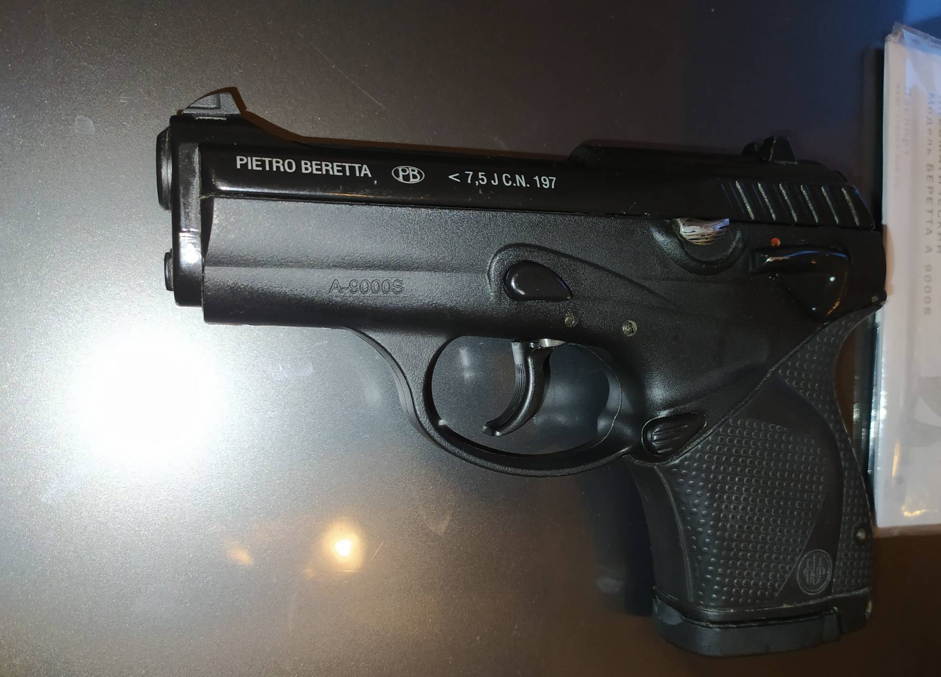 Комплект сам пистолет, запасной магазин и бумажки.