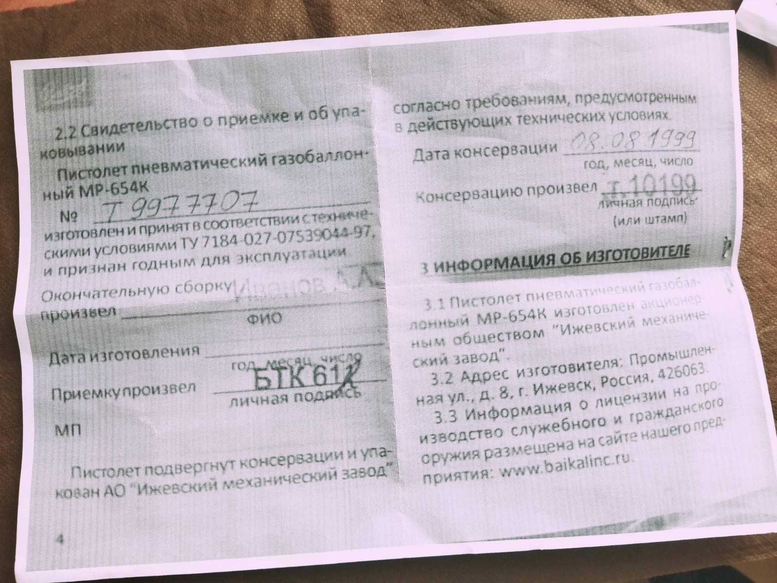 Дополнительные фото ниже, а из документов осталось только это. Слишком много времени прошло с 99 года и пистолет пережил несколько переездов. Оригинал паспорта где-то был утрачен.