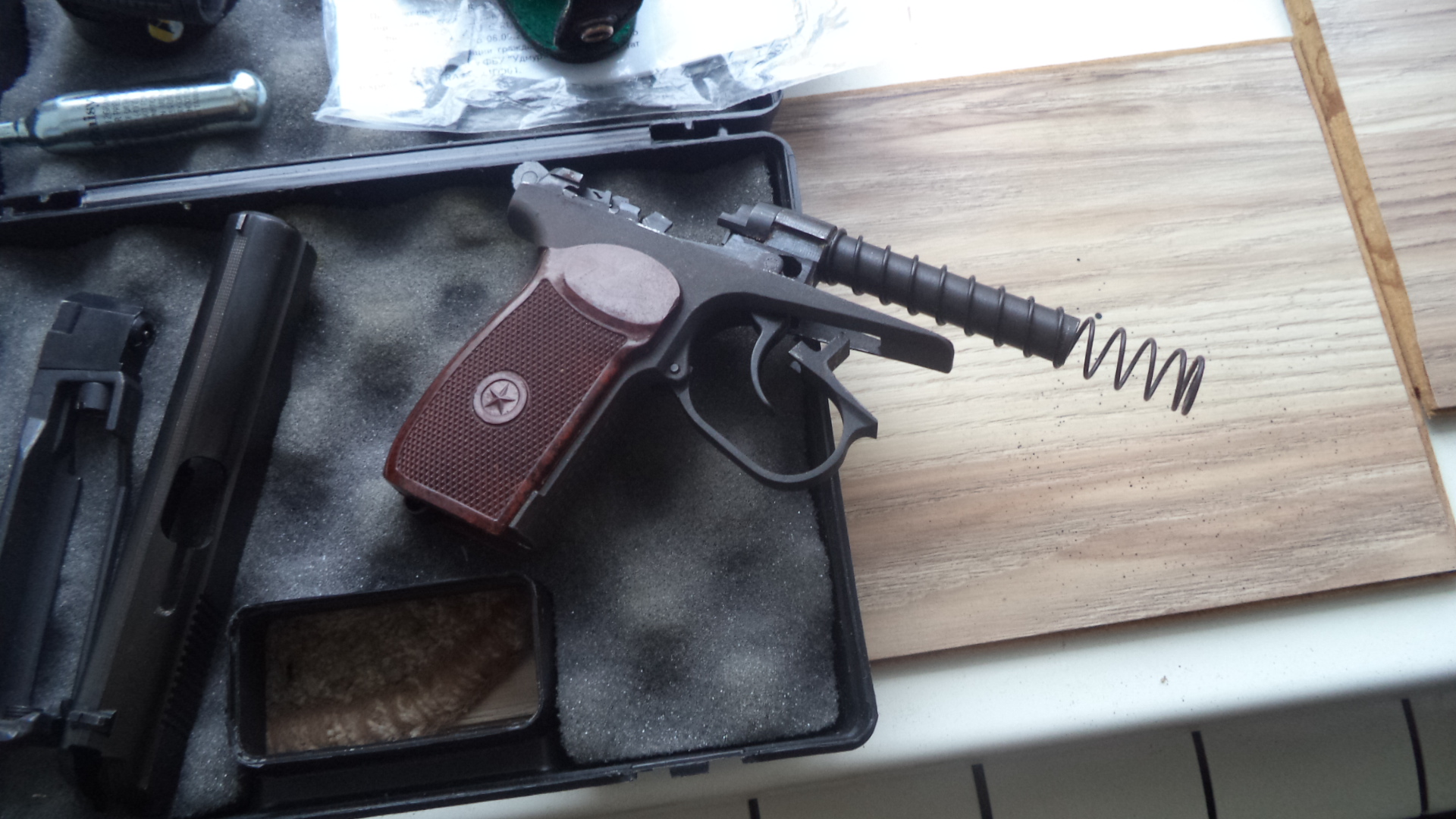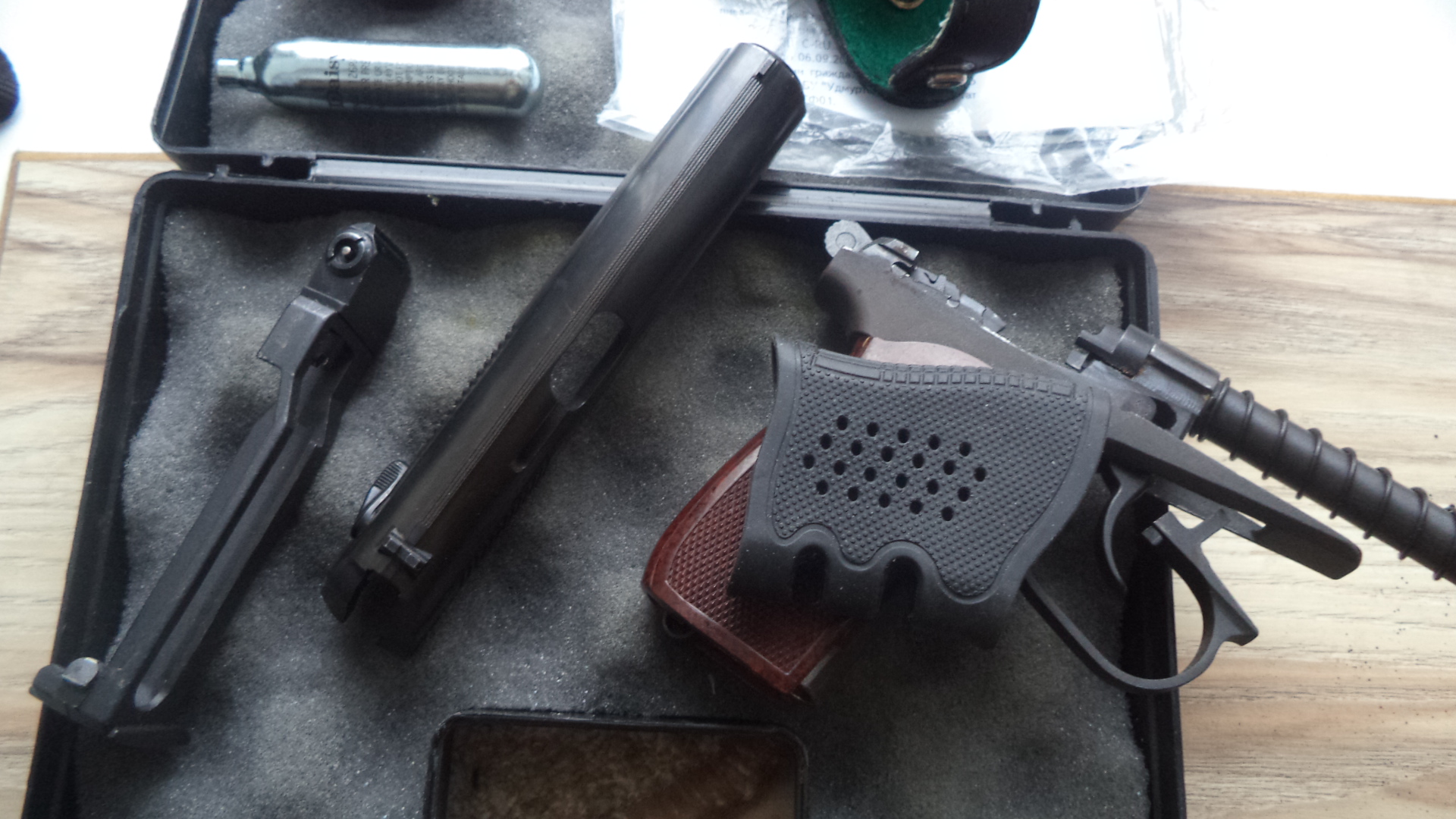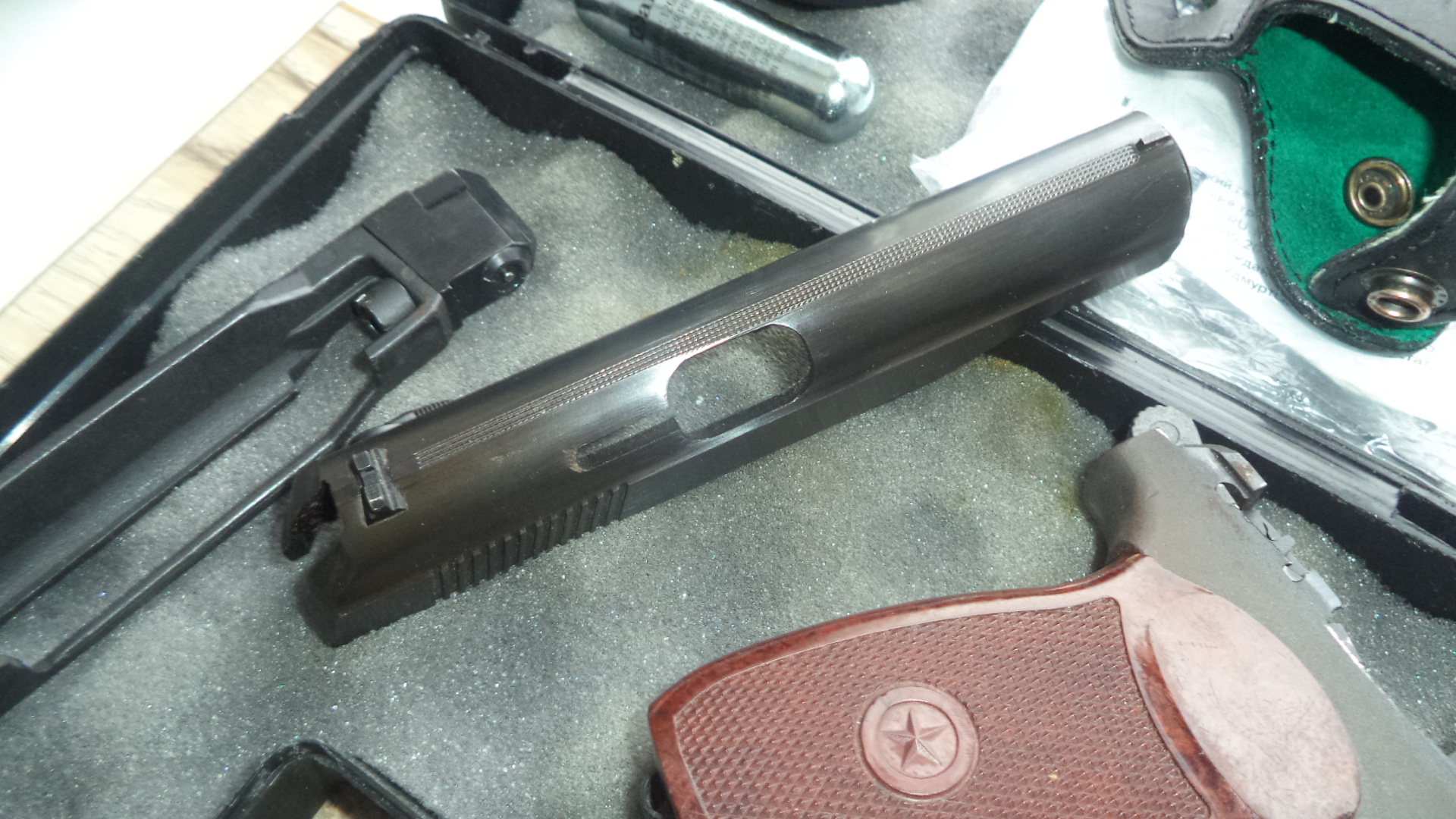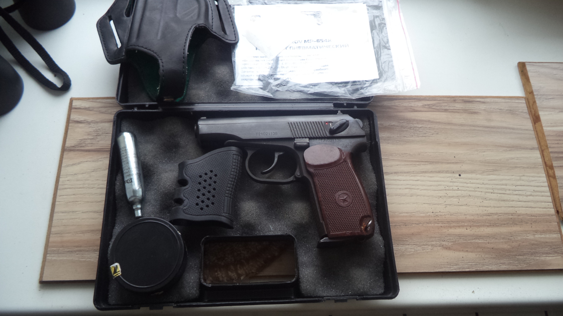 МР654К24. 450р. Состояние нового ( на направляющей ствола видно заводская смазка). Установлена бакелитовая рукоятка, дутая ЗЗ . Есть паз для выбрасывателя. В комплекте кейс Байкал , кобура , документы, инструкция, ключик, шарики , баллон, резиновая накладка для предотвращения скольжения руки, сам пистолет. Зазора между гайкой ствола и магазином нет. Все вопросы по номеру 80336863322. Вайбер . Почта.